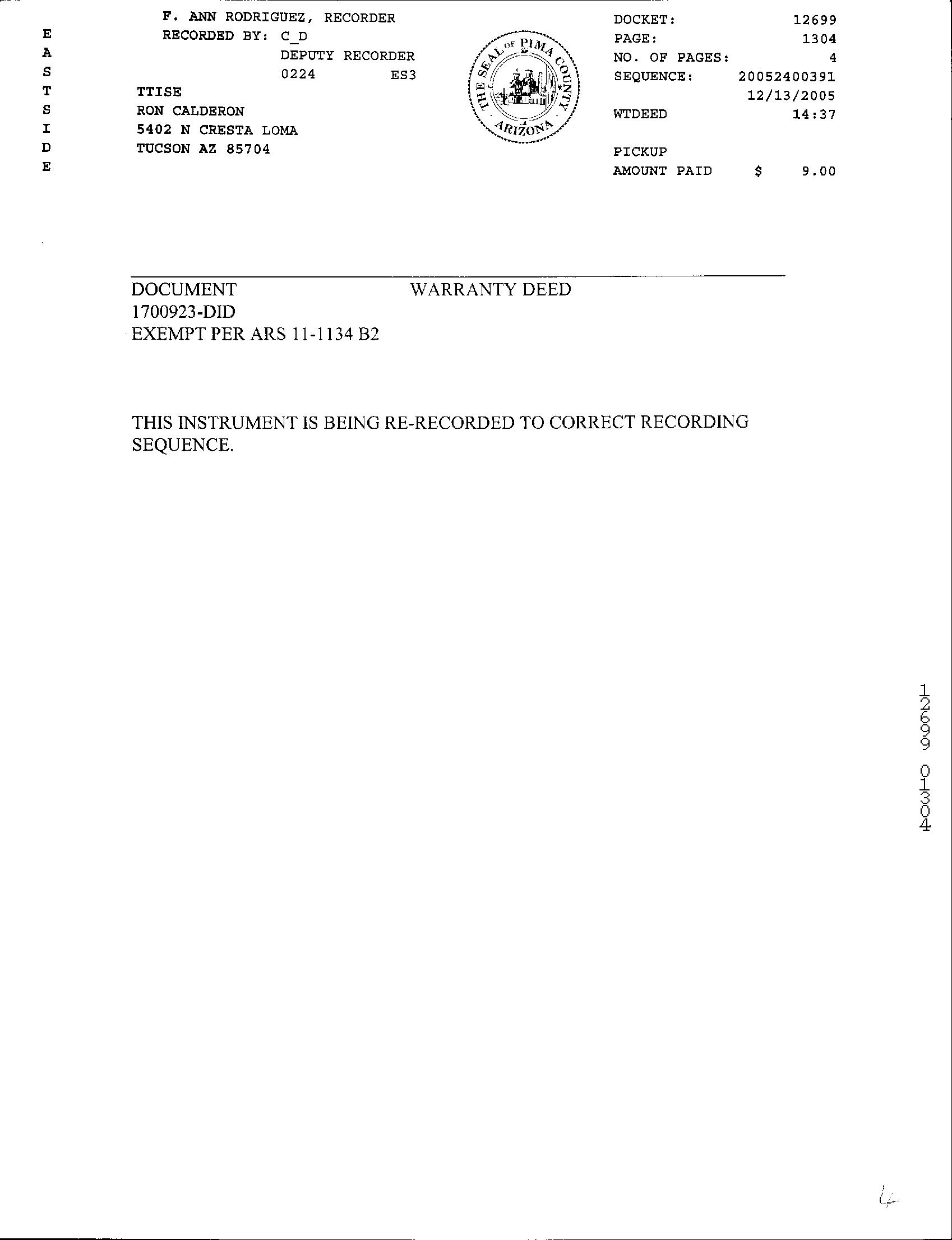 Mailing Address : 5406 N Cresta Loma Dr, Tucson AZ 85704-3702 C012