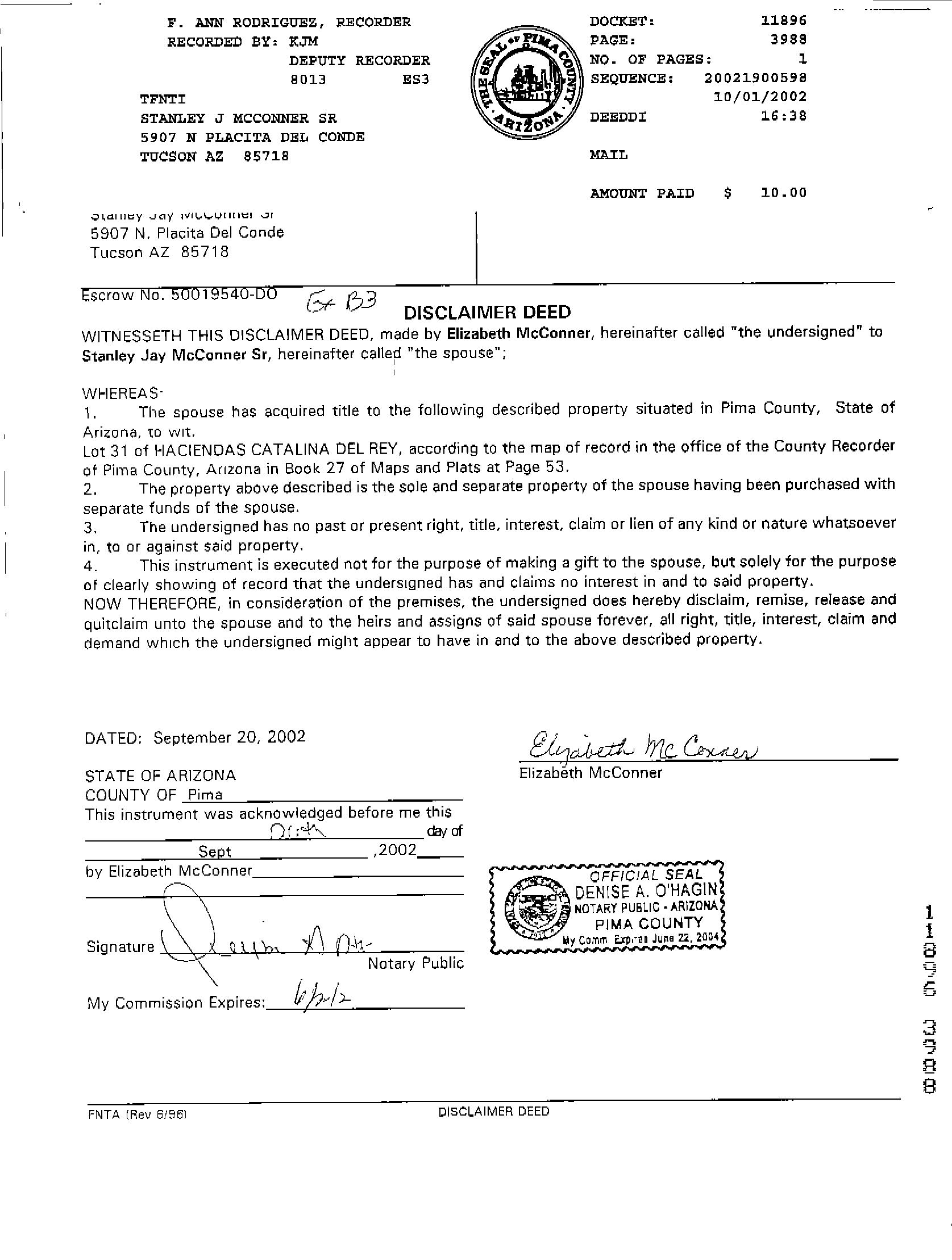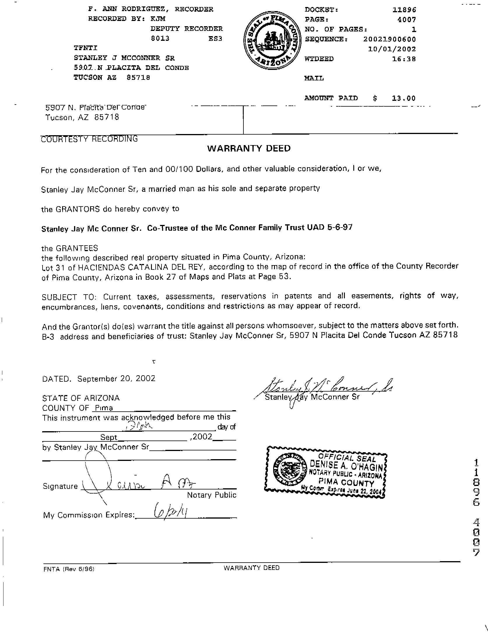 Owner Name: Mc Conner Family / APN / Alternate APN: 109-06-2150 / Deed Type: Deed (reg)