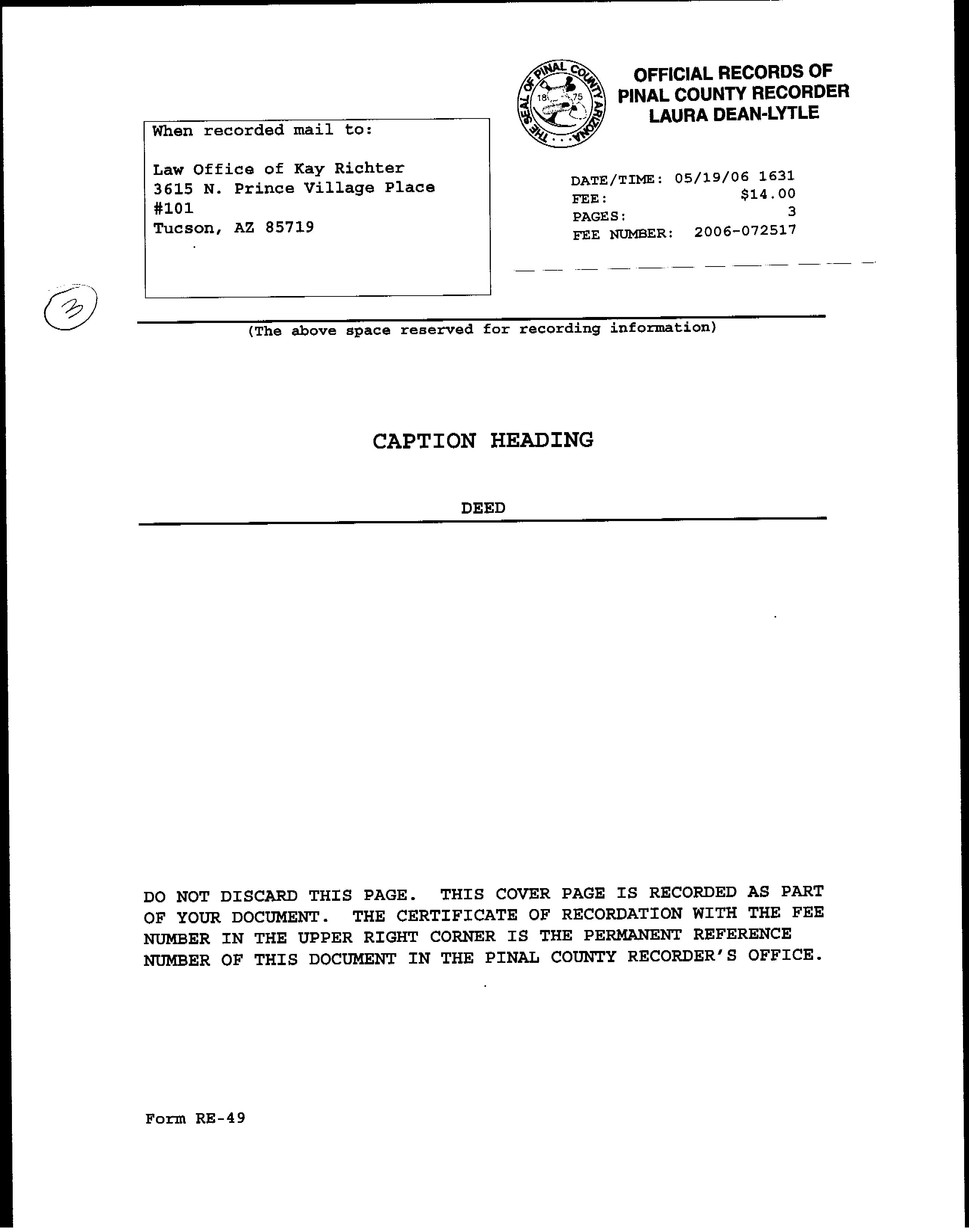 Mailing Address : 64345 E Round Robin Ln, Tucson AZ 85739-1066 R077
