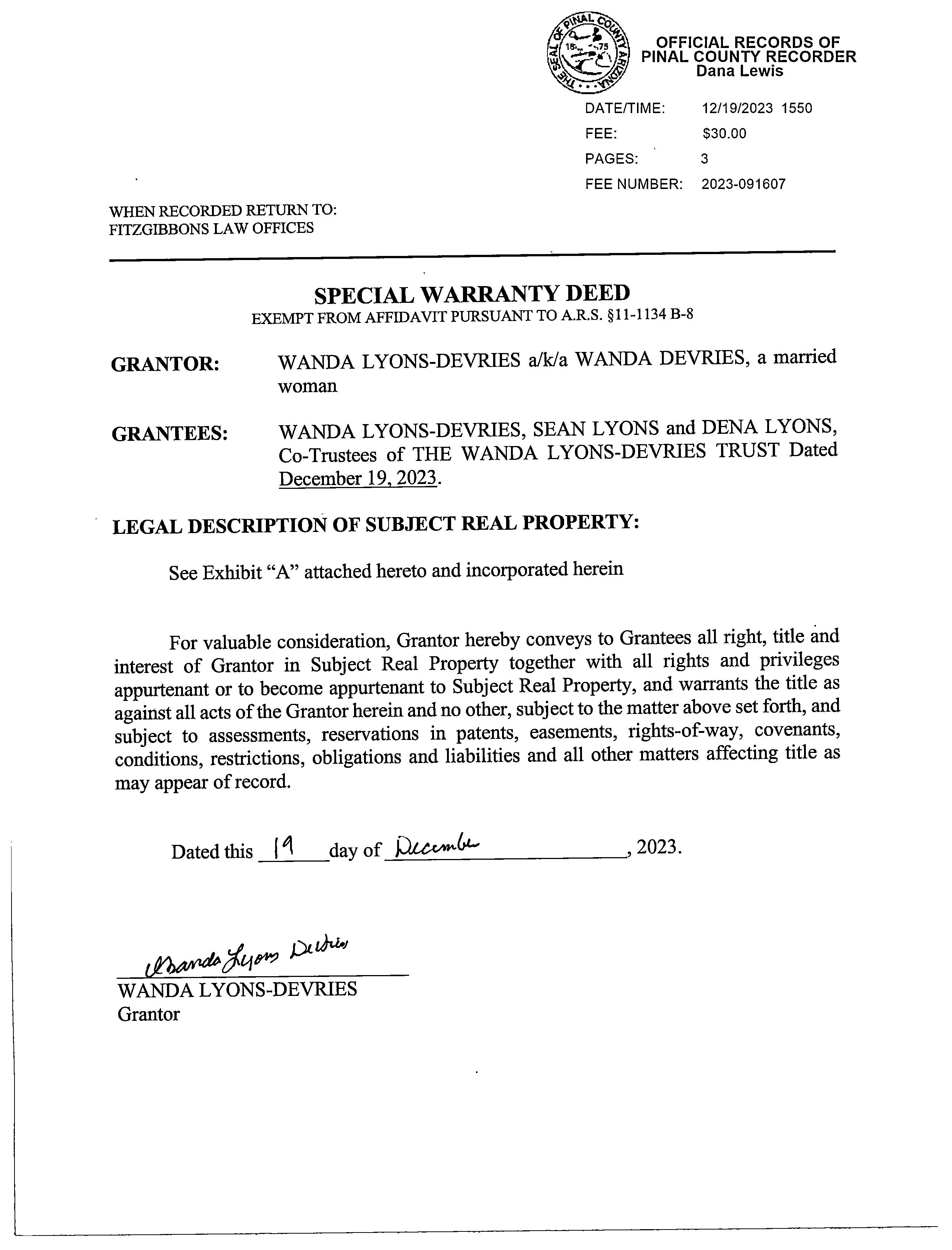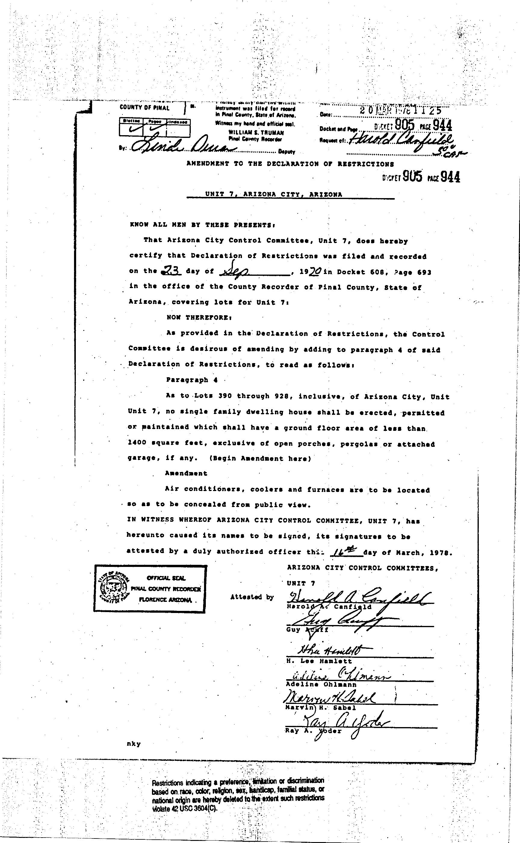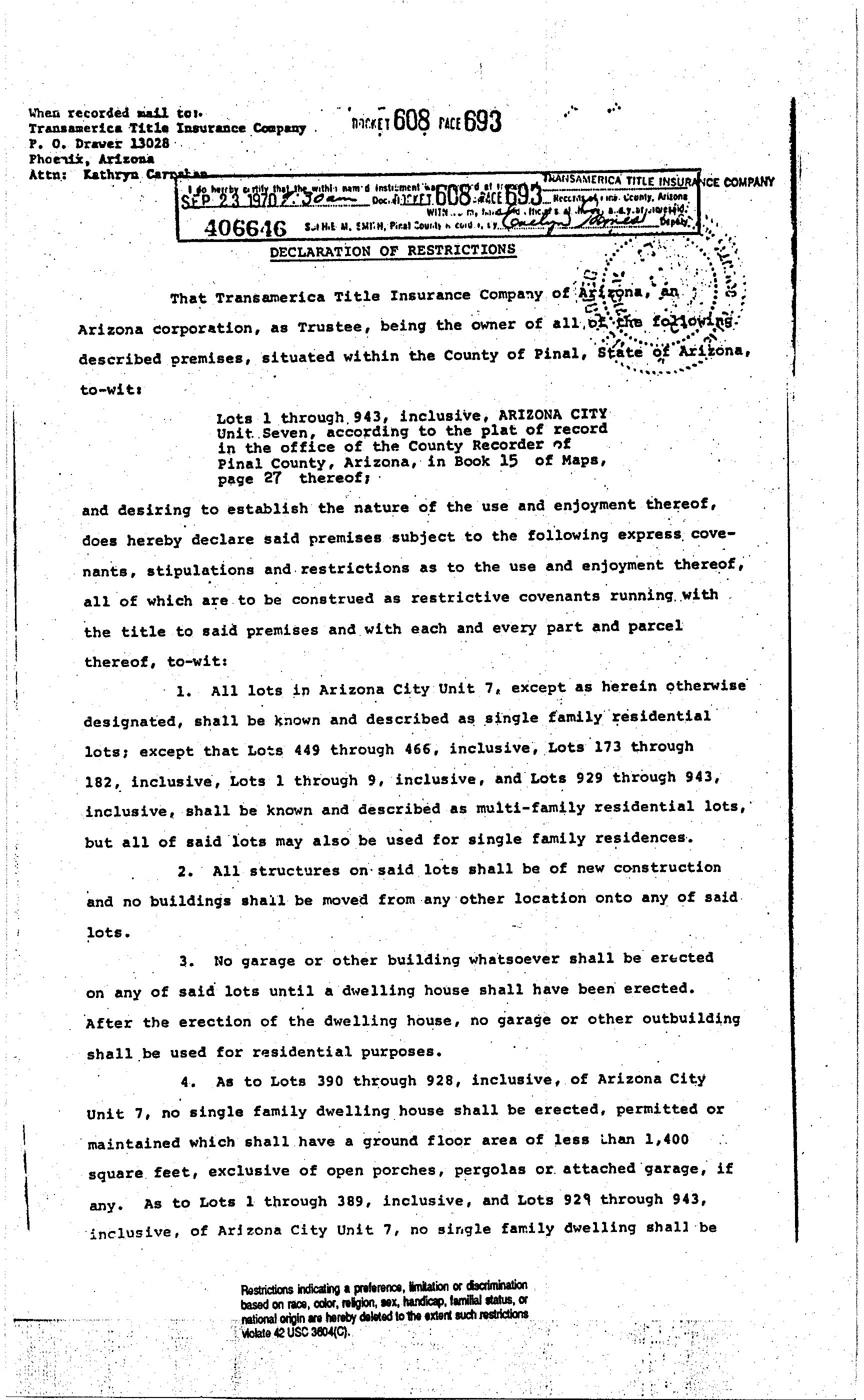 LEGAL: LOTS 474 AND 475 OF ARIZONA CITY UNIT SEVEN, ACCORDING TO THE PLAT OF RECORD IN BOOK 15 OF MAPS, PAGE 27, SECTION 7, TOWNSHIP 08 SOUTH, RANGE 07 EAST, PINAL COUNTY, ARIZONA. 0.51 ACRES. CURRENT TAXES INFORMATION THROUGH 07/15/2024