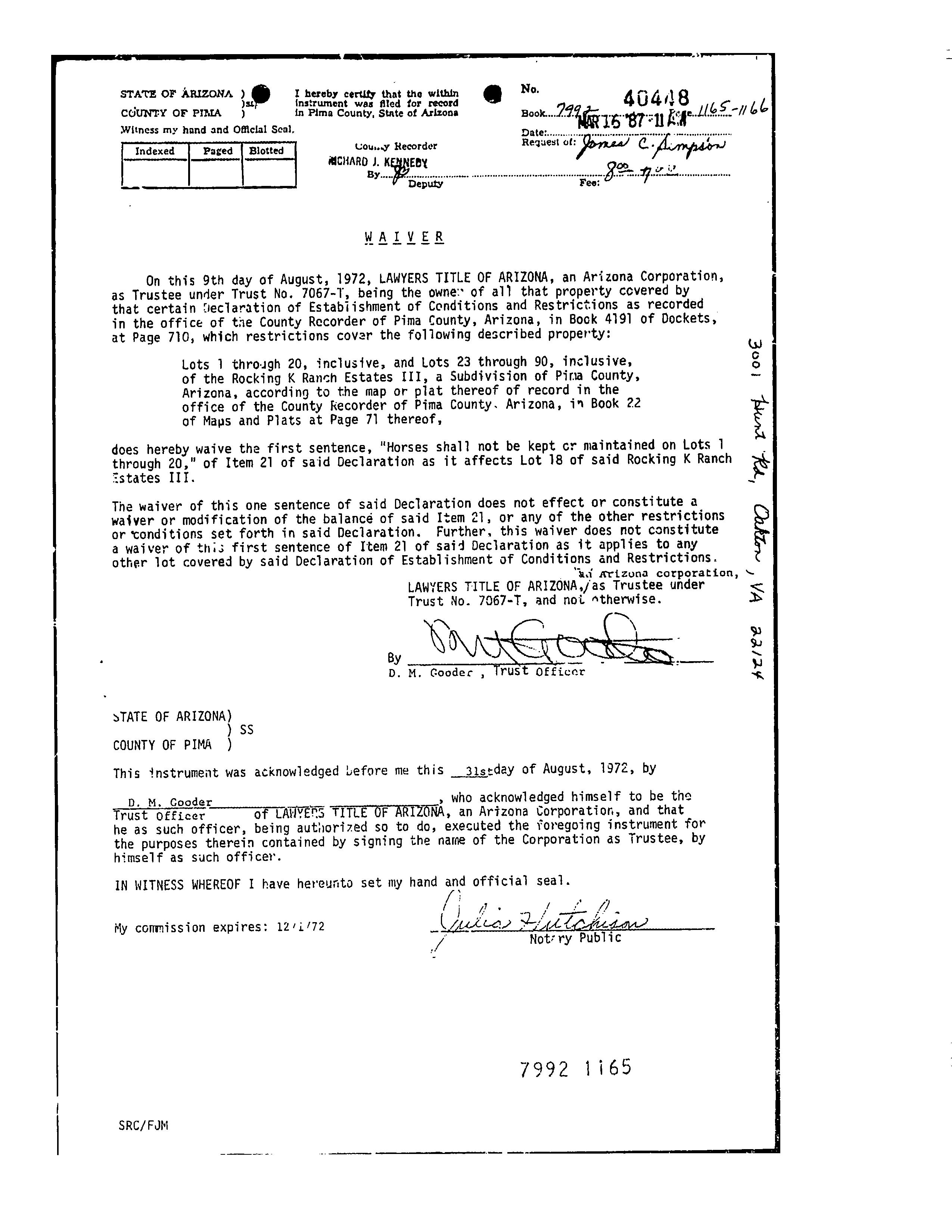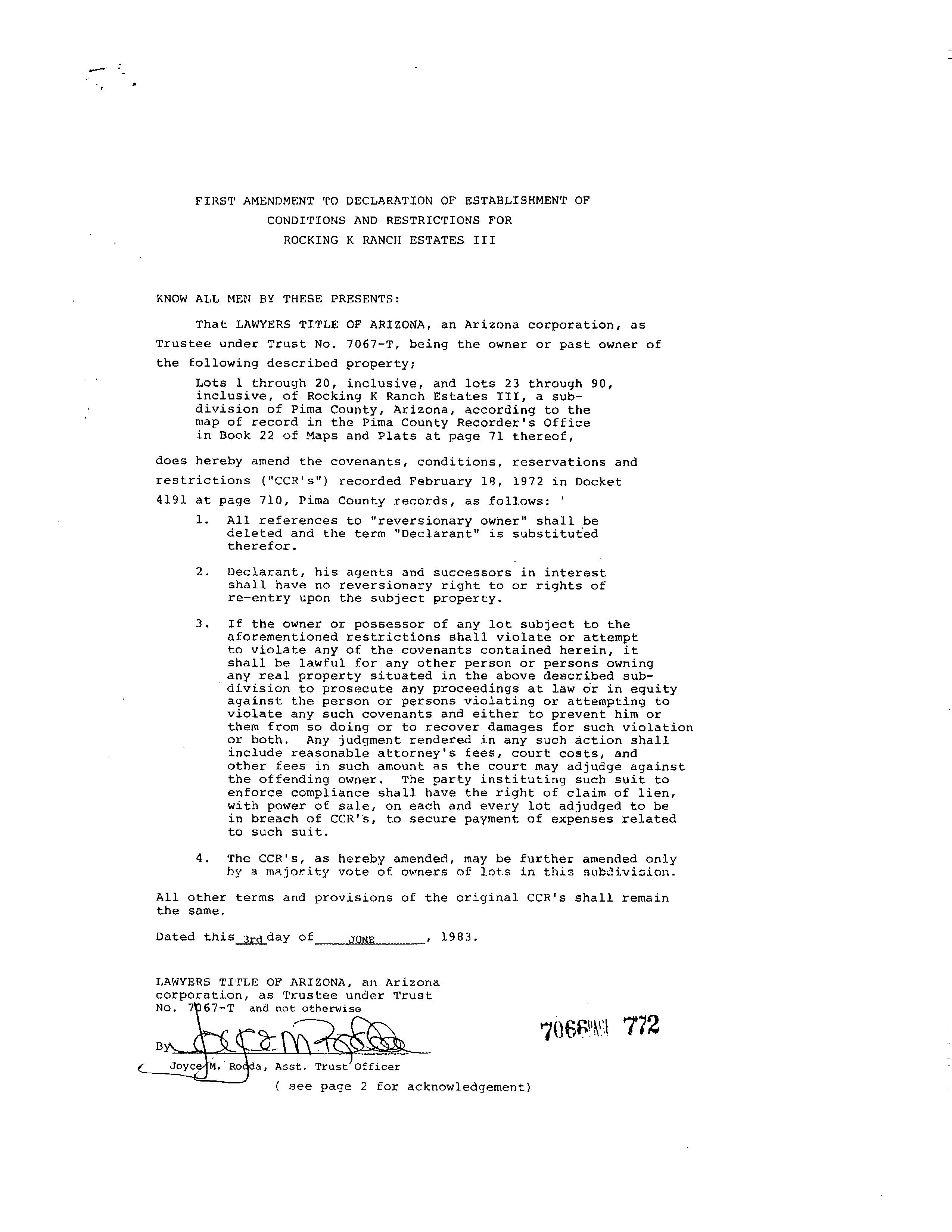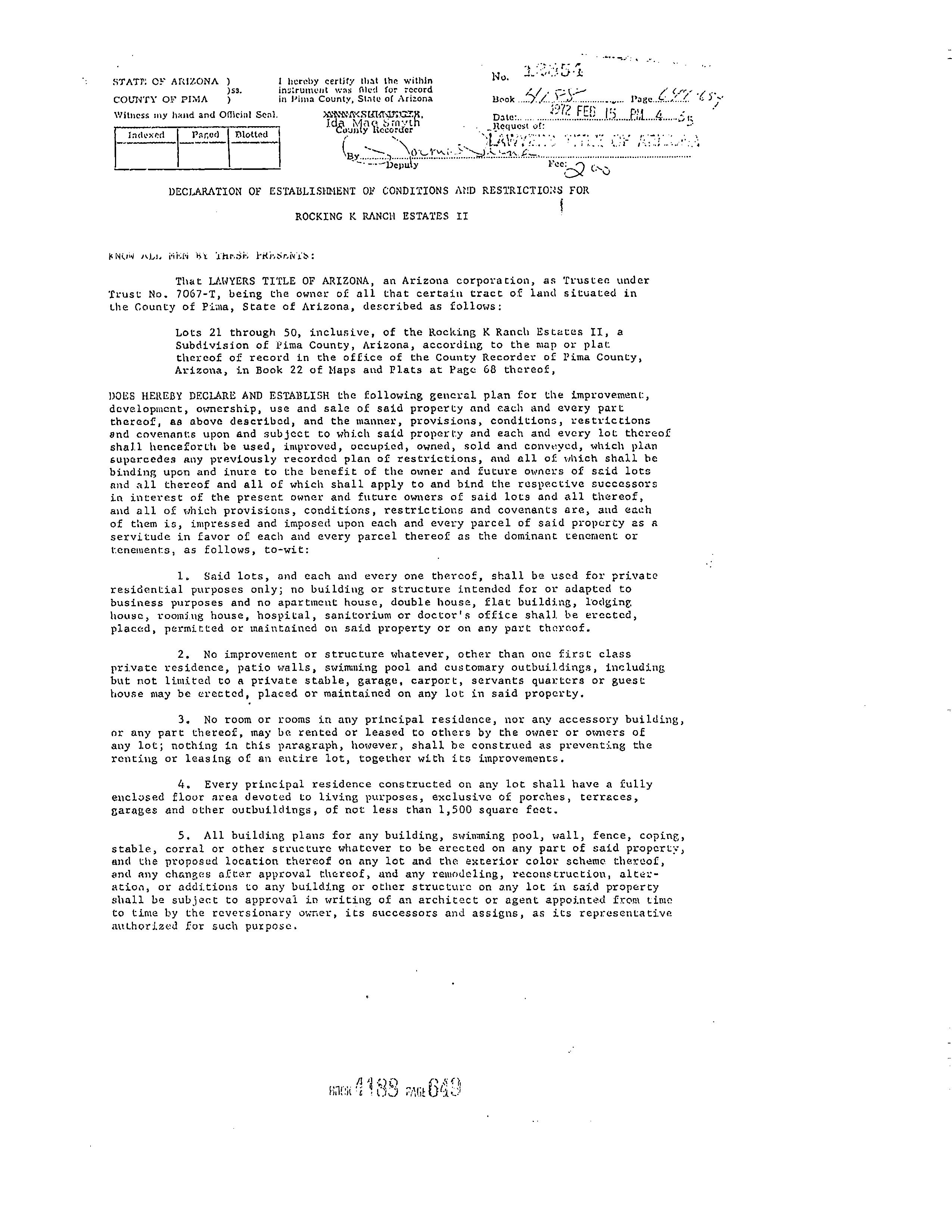 ©2021 First American Financial Corporation and/or its affiliates. All rights reserved. NYSE: FAF 05252610821 COVENANTS, CONDITIONS & RESTRICTIONS PREPARED FOR : First American Title Insurance Company, and the operating divisions thereof, make no express or implied warranty respecting the information presented and assume no responsibility for errors or omissions. First American, the eagle logo, First American Title, and firstam.com are registered trademarks or trademarks of First American Financial Corporation and/or its affiliates. 12300 E Calle Miel #63 Tucson, AZ 85747