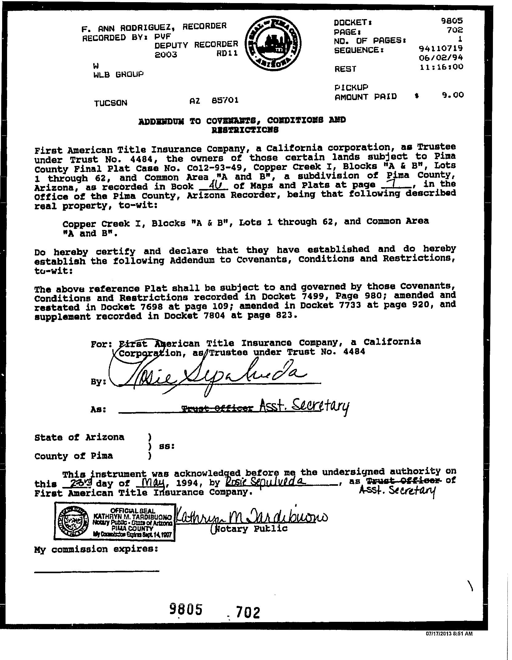 This information is furnished without fee and without benefit of a complete title search. No liability is assumed by First American Title. If it is desired that liability be assumed, you may apply for a policy of title insurance with First American Title Insurance Company.