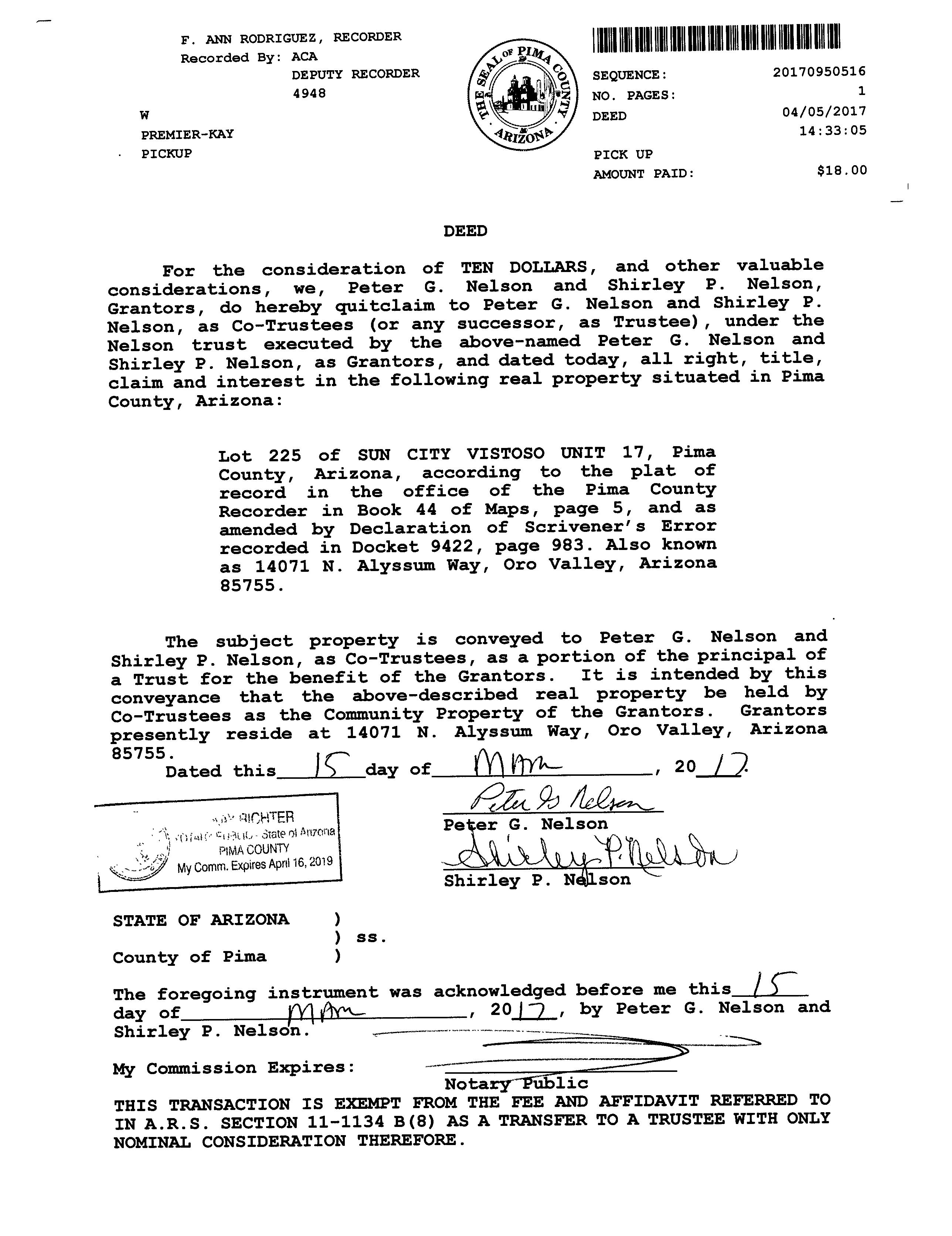 Legal Description : Sun City Vistoso Unit 17 Lot 225 (m&p 44/5)