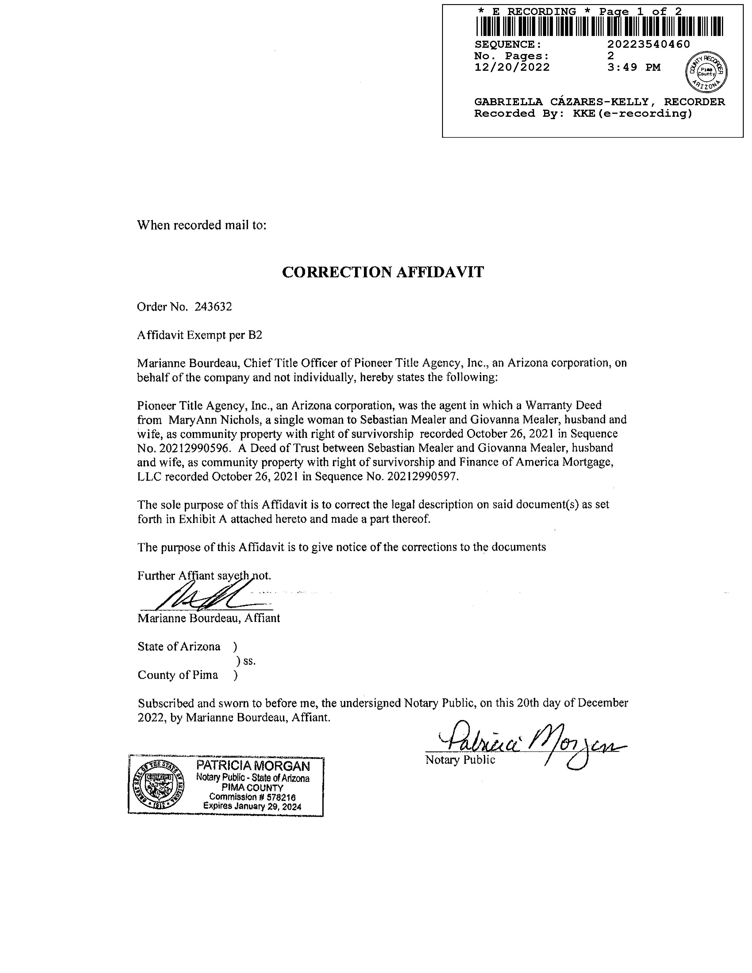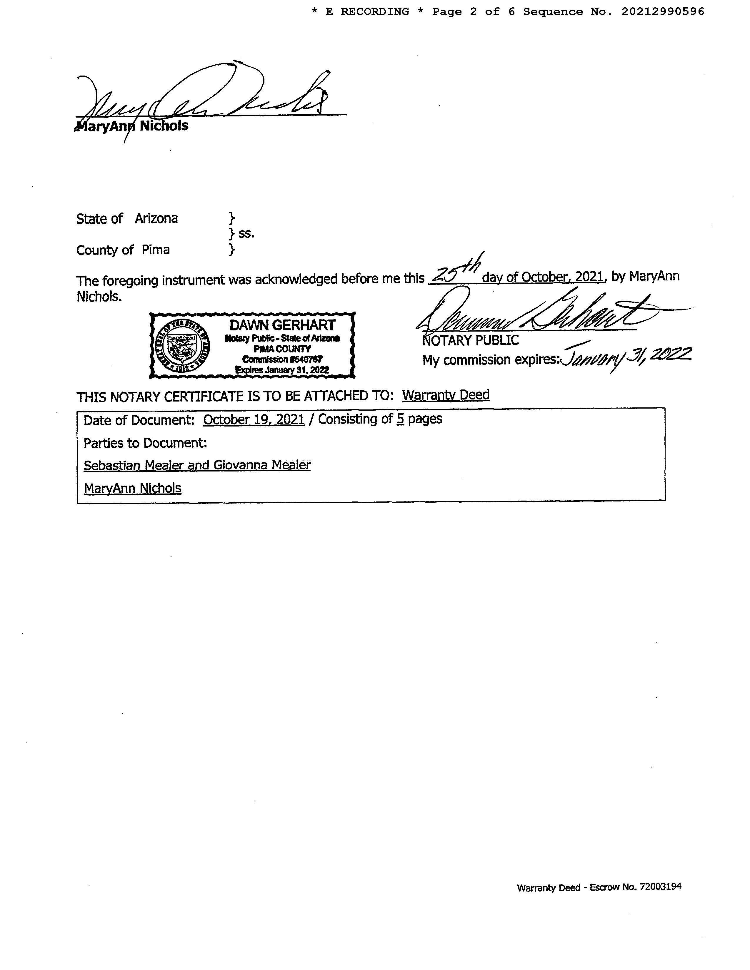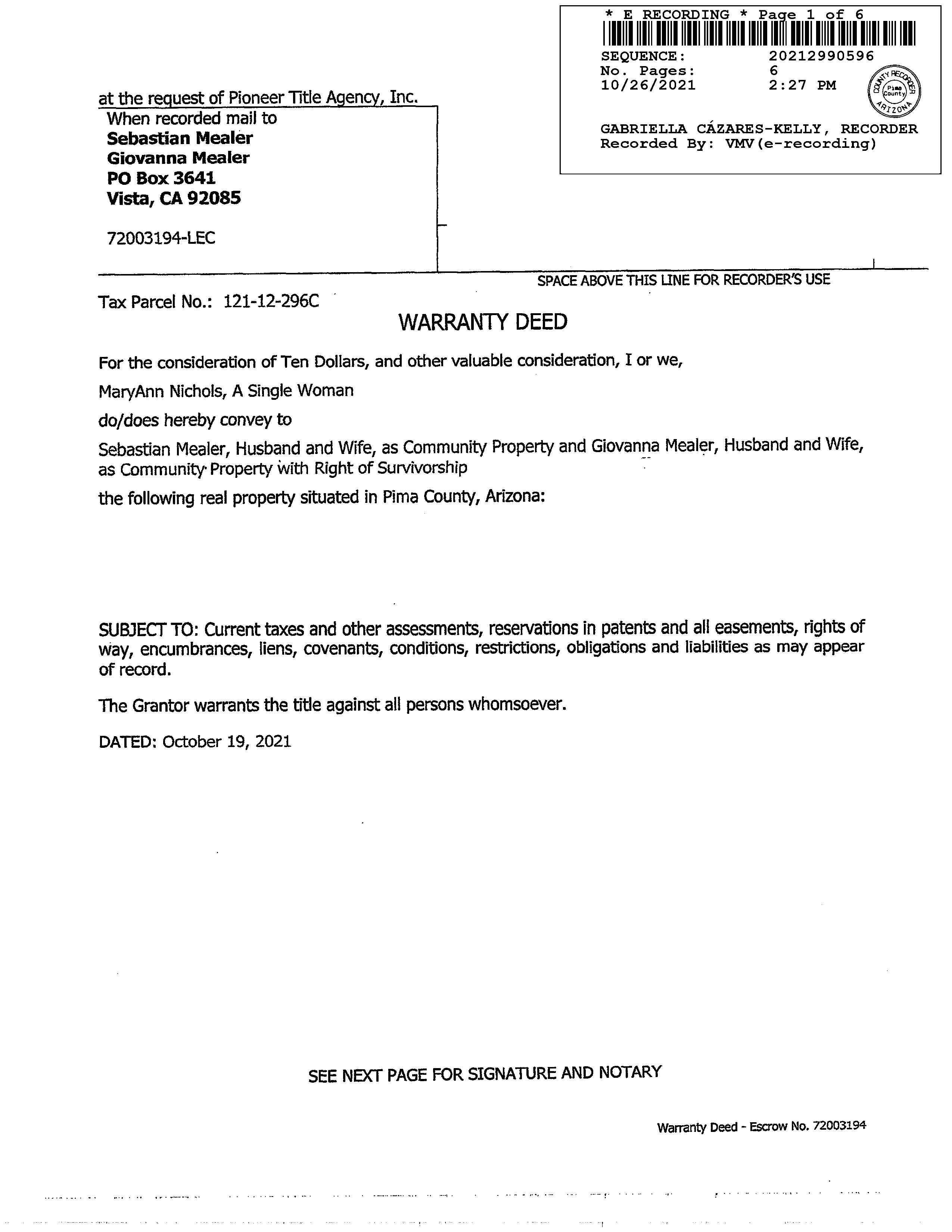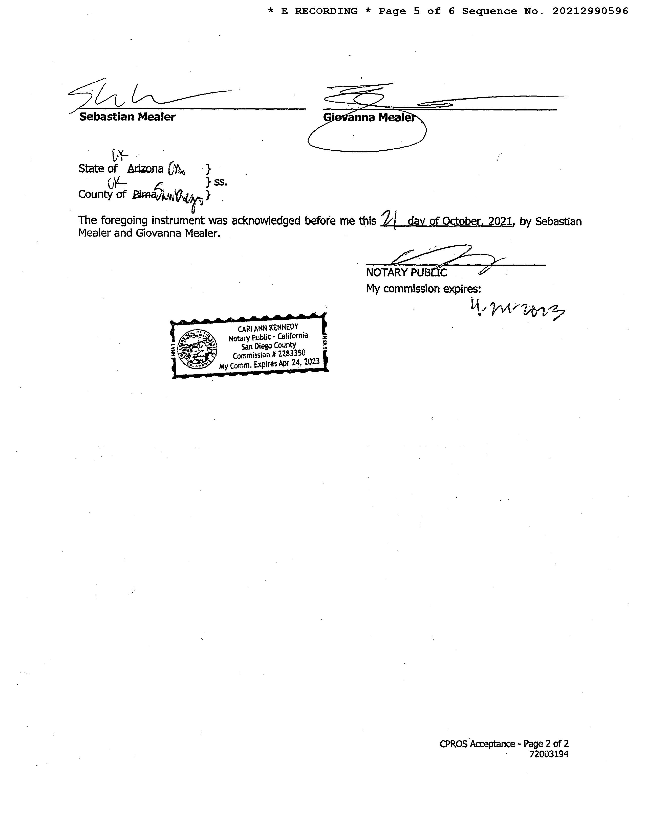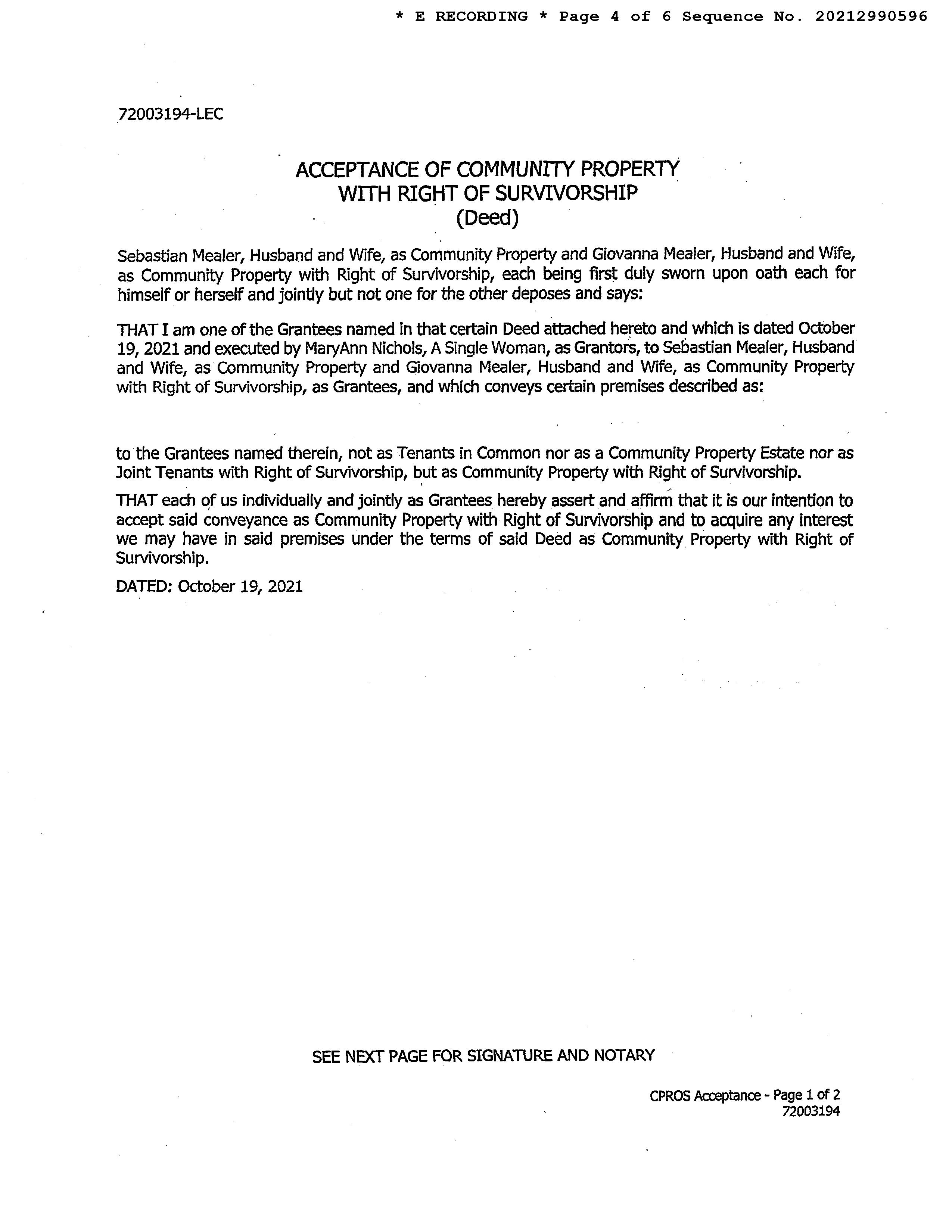 OWNER: MEALER SEBASTIAN & GIOVANNA AFFIDAVIT 2021 2990596 10/26/2021
