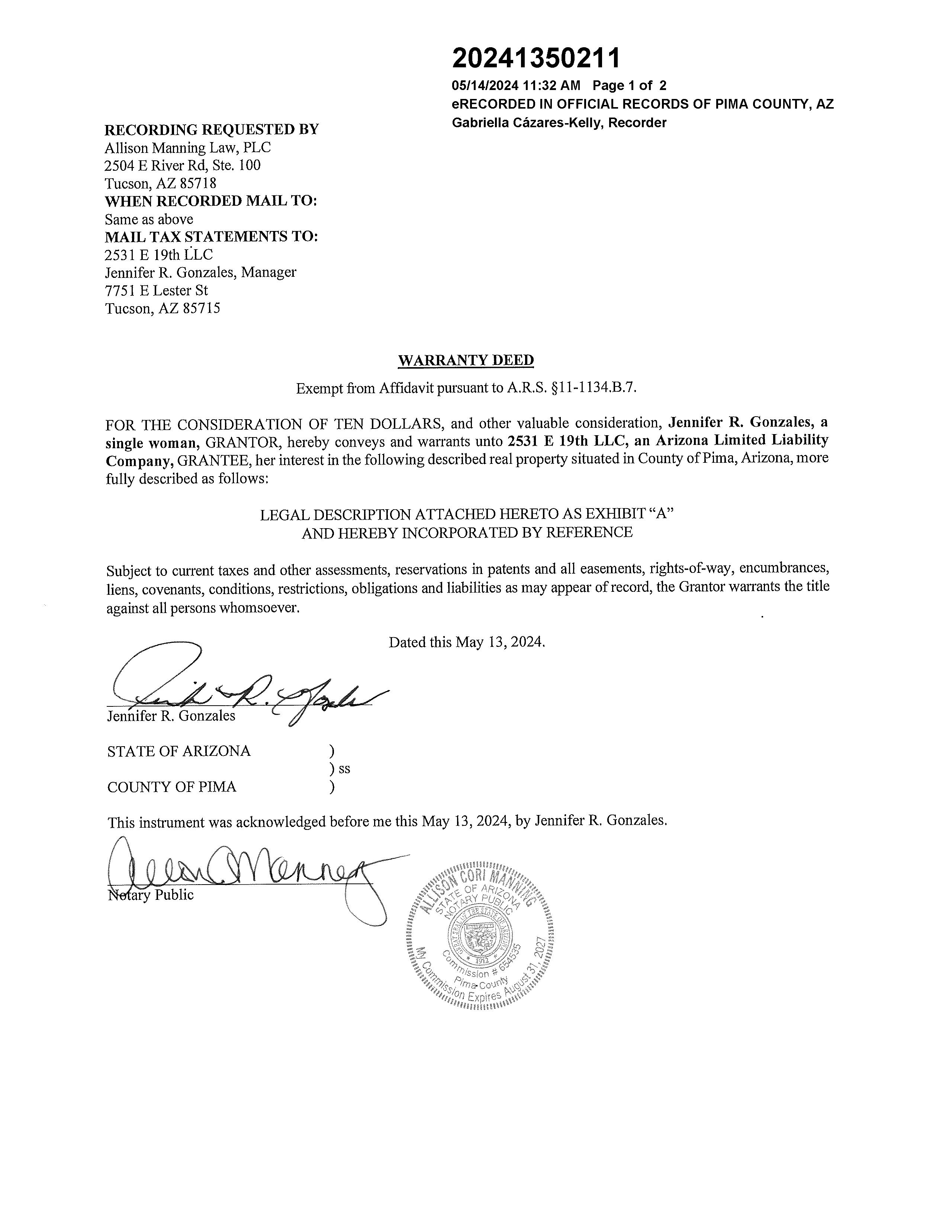 OWNER: 2531 E 19TH LLC AFFIDAVIT 2024 1350211 05/14/2024