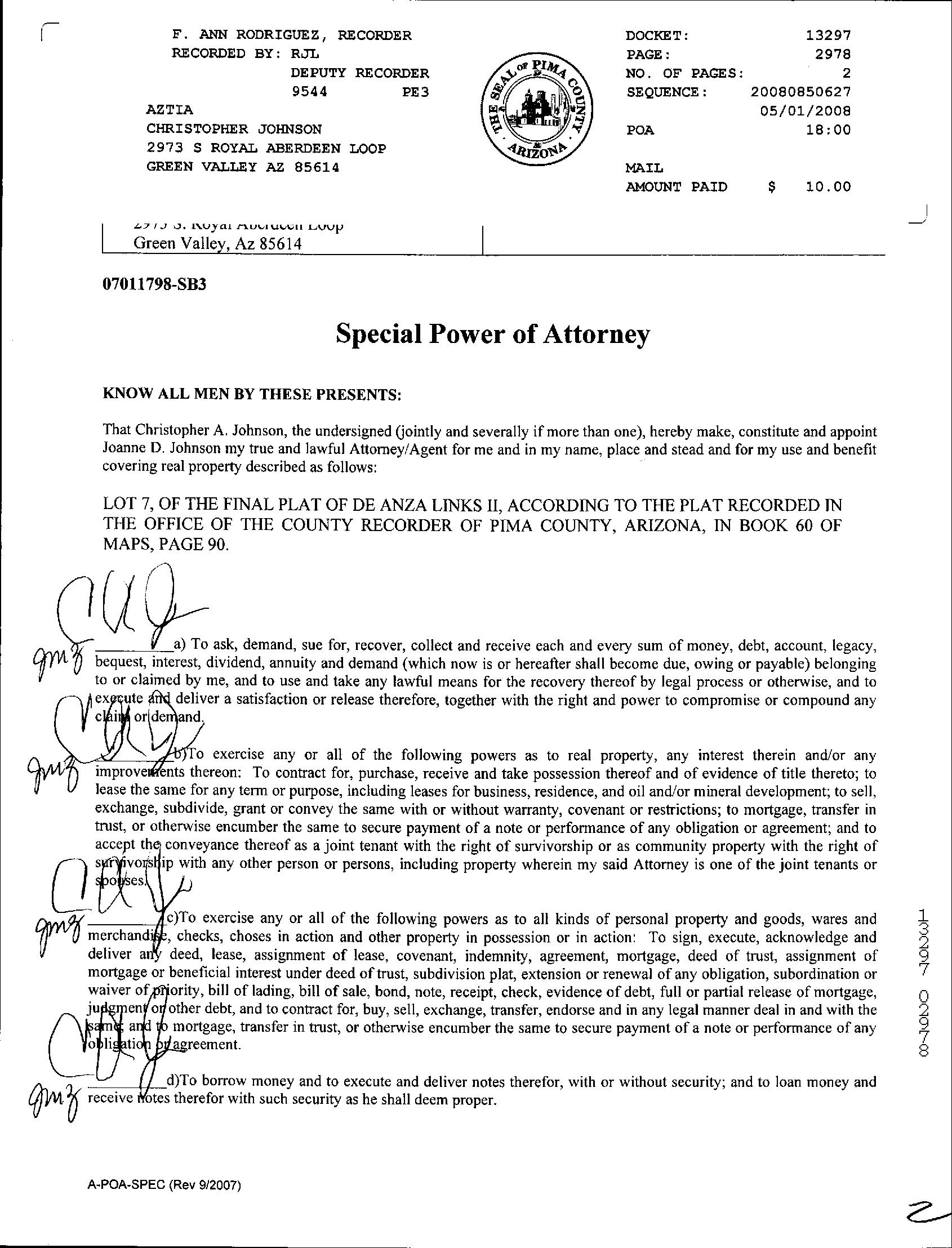Mailing Address : 2973 S Royal Aberdeen Loop, Green Valley AZ 85614-1156 C055