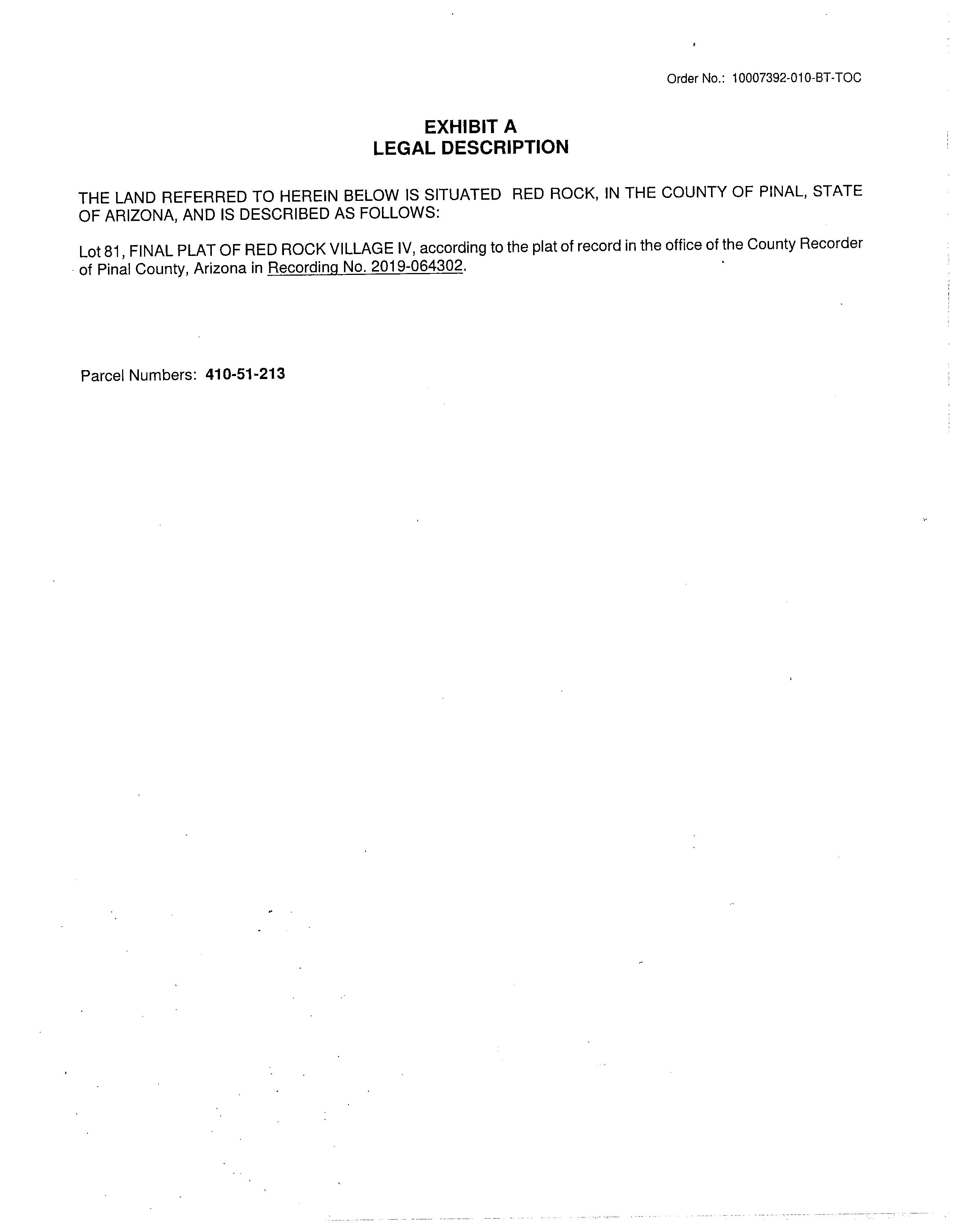 Legal Description : Lot 81 Of Red Rock Village Iv, According To The Plat Of Record Inthe Office Of The Pinal County Recorder, Arizona, Recorded In Fee No. 2019-064302, Located In Section 08, Township 10 South, Range 10 East, 6,161 Square Feet 0.14 Acres