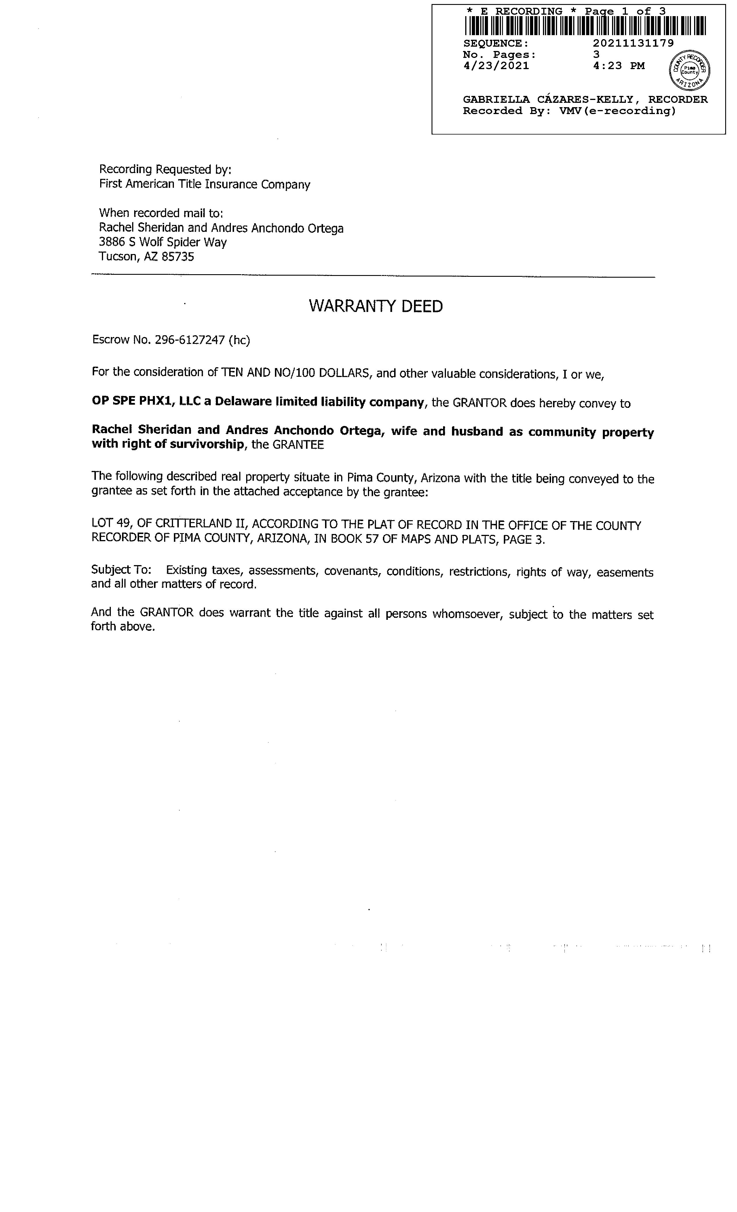 Mailing Address : 3886 S Wolf Spider Way, Tucson AZ 85735-5207 R090
