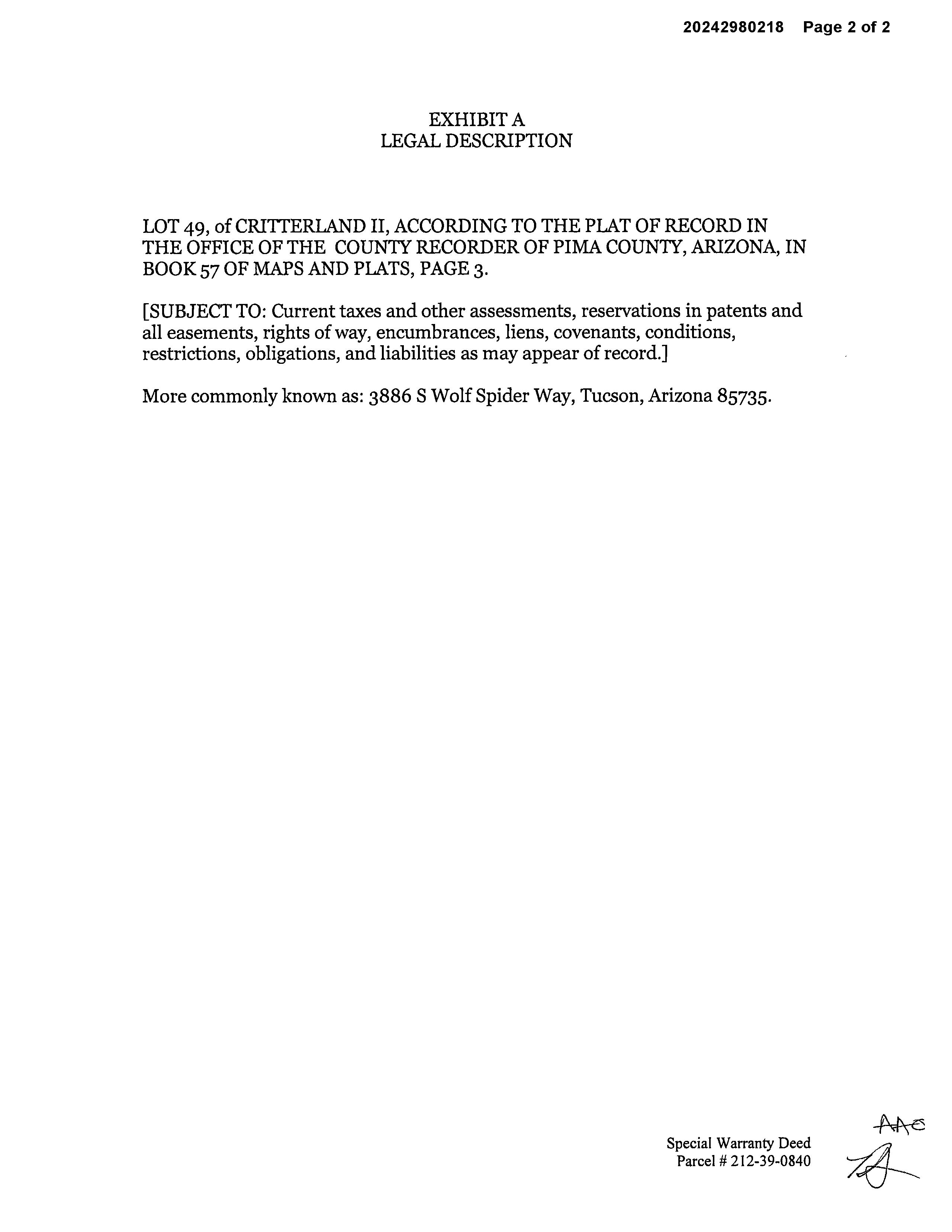 Subject Property : 3886 S Wolf Spider Way Tucson AZ 85735