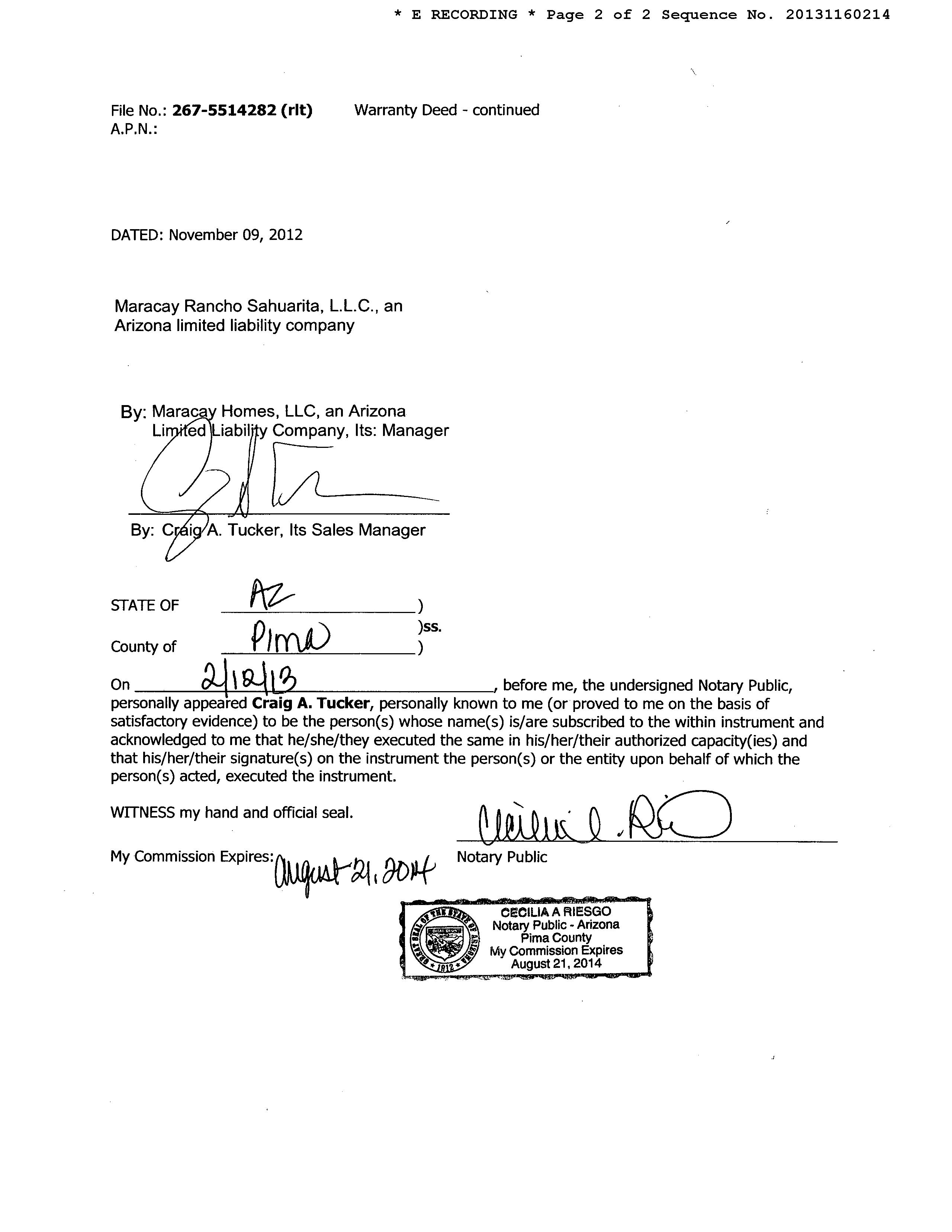 253,594 2013 1160214 SW MARACAY RANCHO SAHUARITA 11/27/2012 90,000 2012 3320233 SW KLONDIKE LAND PORTFOLIO M