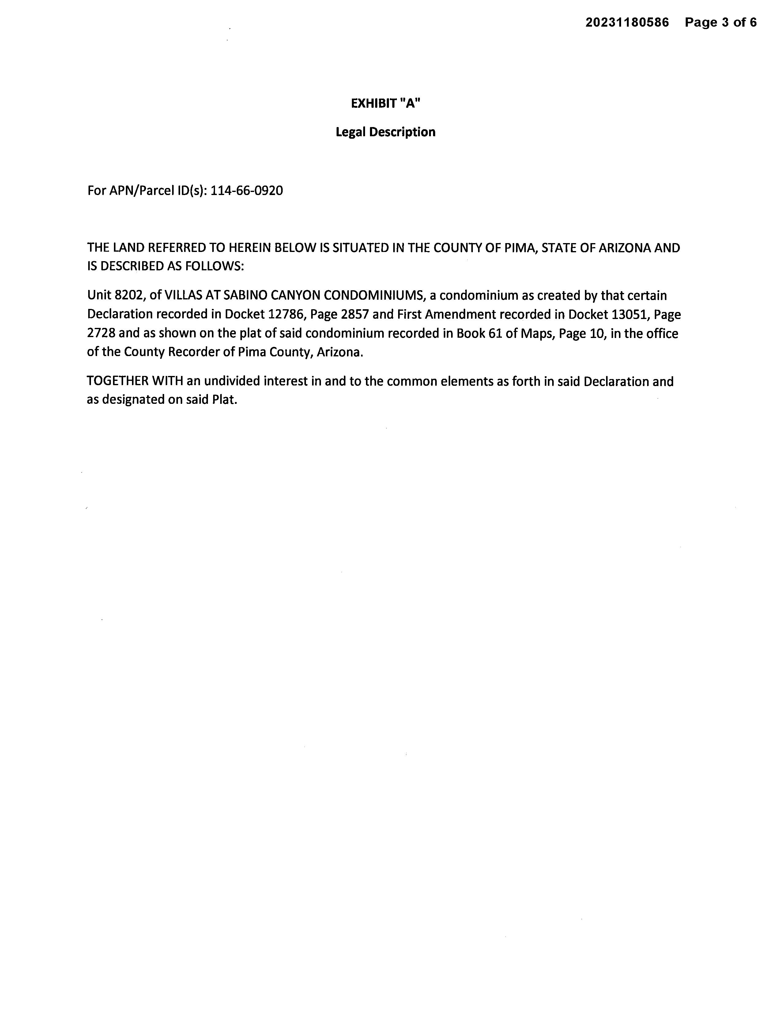LEGAL: VILLAS AT SABINO CANYON CONDOMINIUM BLDG 8 UNIT 8202 & 1 LCEP PARKING UNIT & .792% INT COMMON ELEMENT