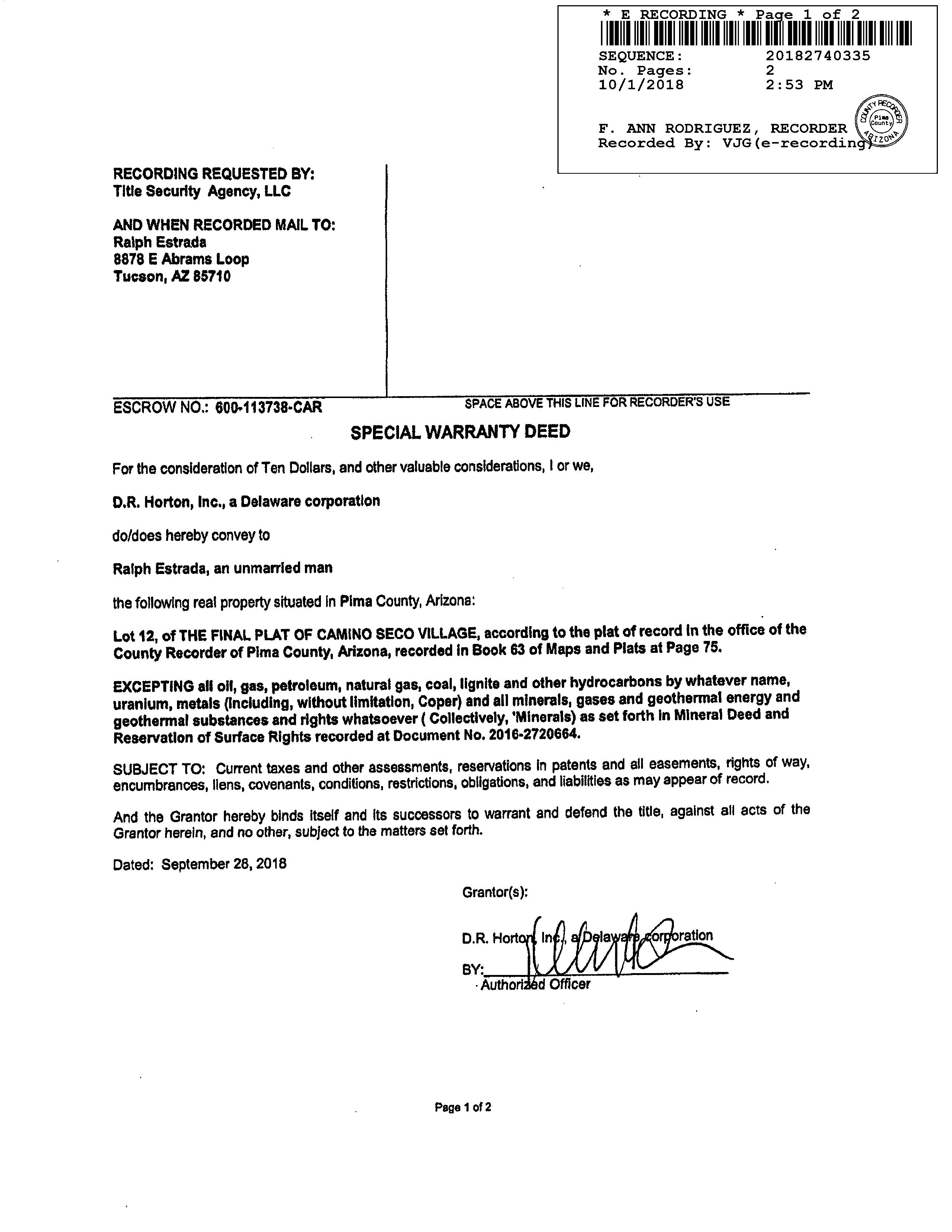 OWNER: ESTRADA RALPH AFFIDAVIT 2018 2740335 10/01/2018