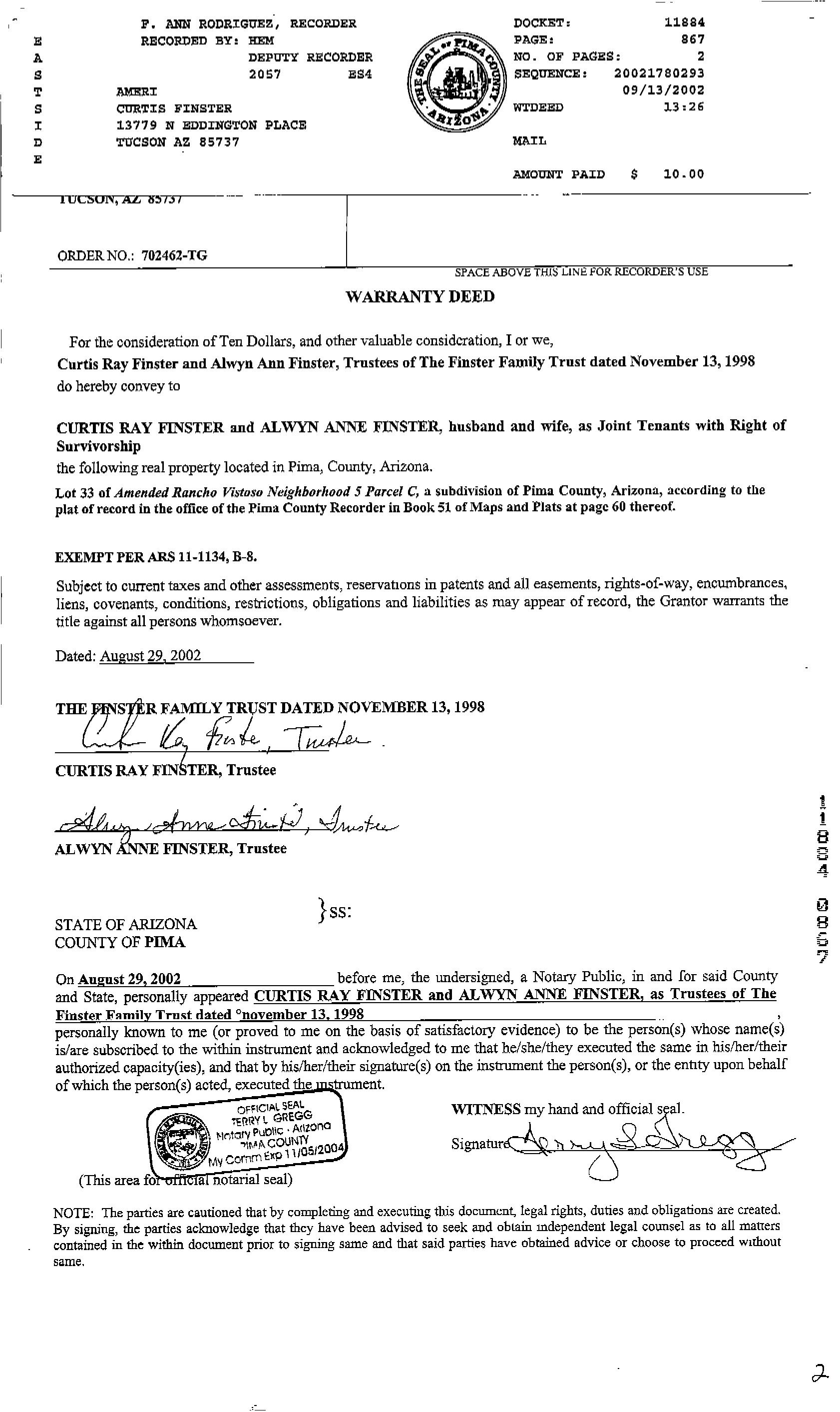 OWNER: FINSTER FAMILY TR     10943 3349 12/15/1998