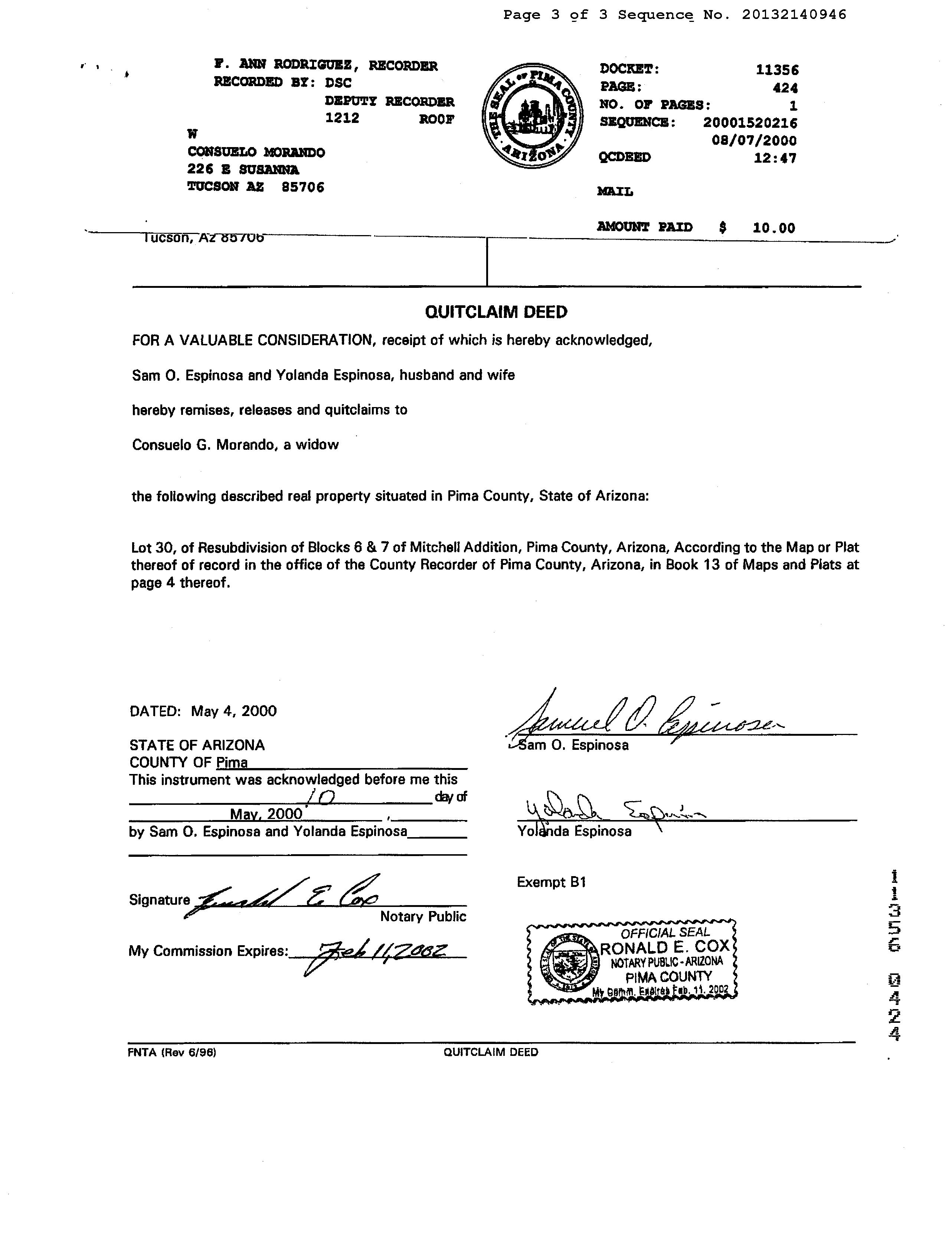 Owner Name: Valenzuela Jacqueline M / APN / Alternate APN: 138-18-0130 / Deed Type: Warranty Deed