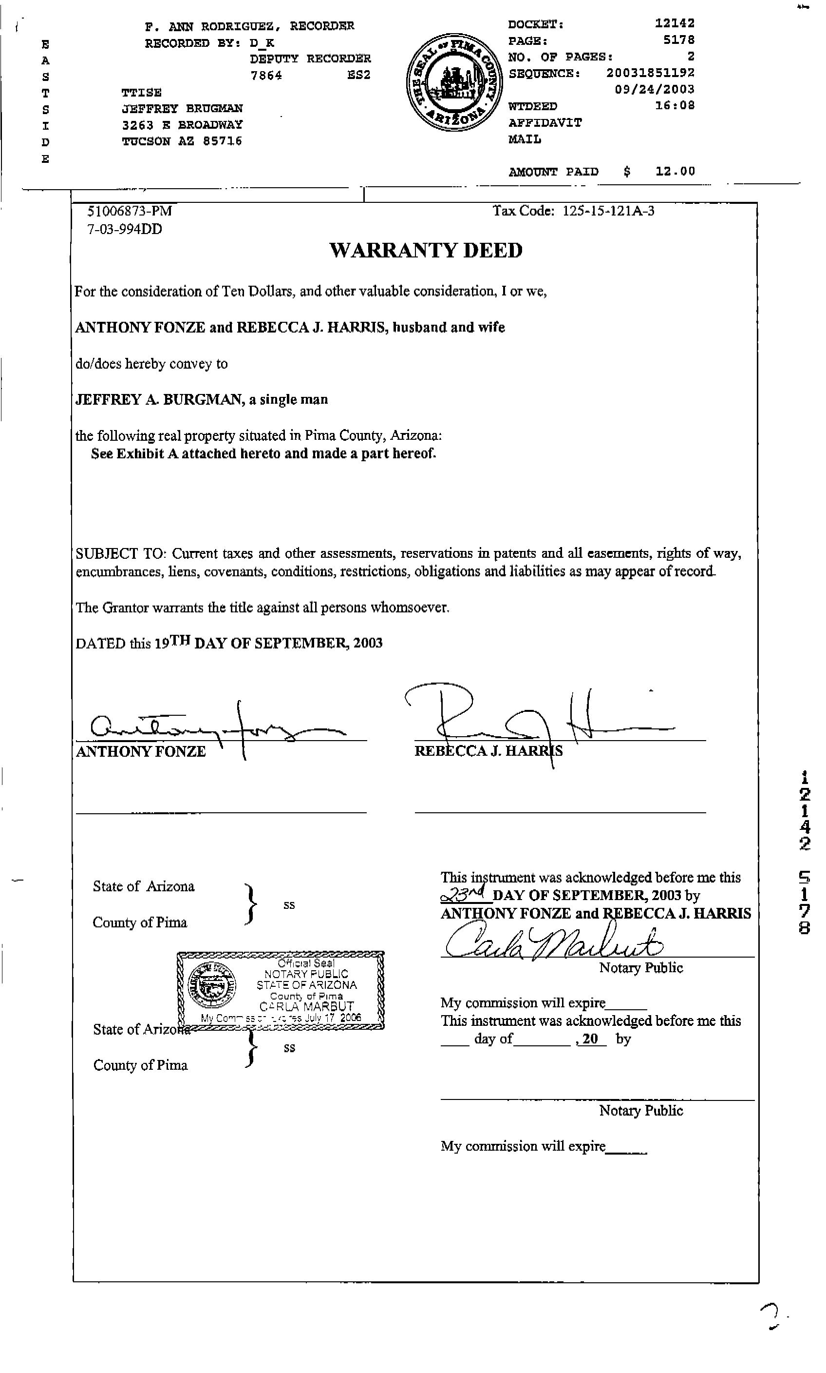 OWNER: BURGMAN JEFFREY A 12142 5178 09/24/2003