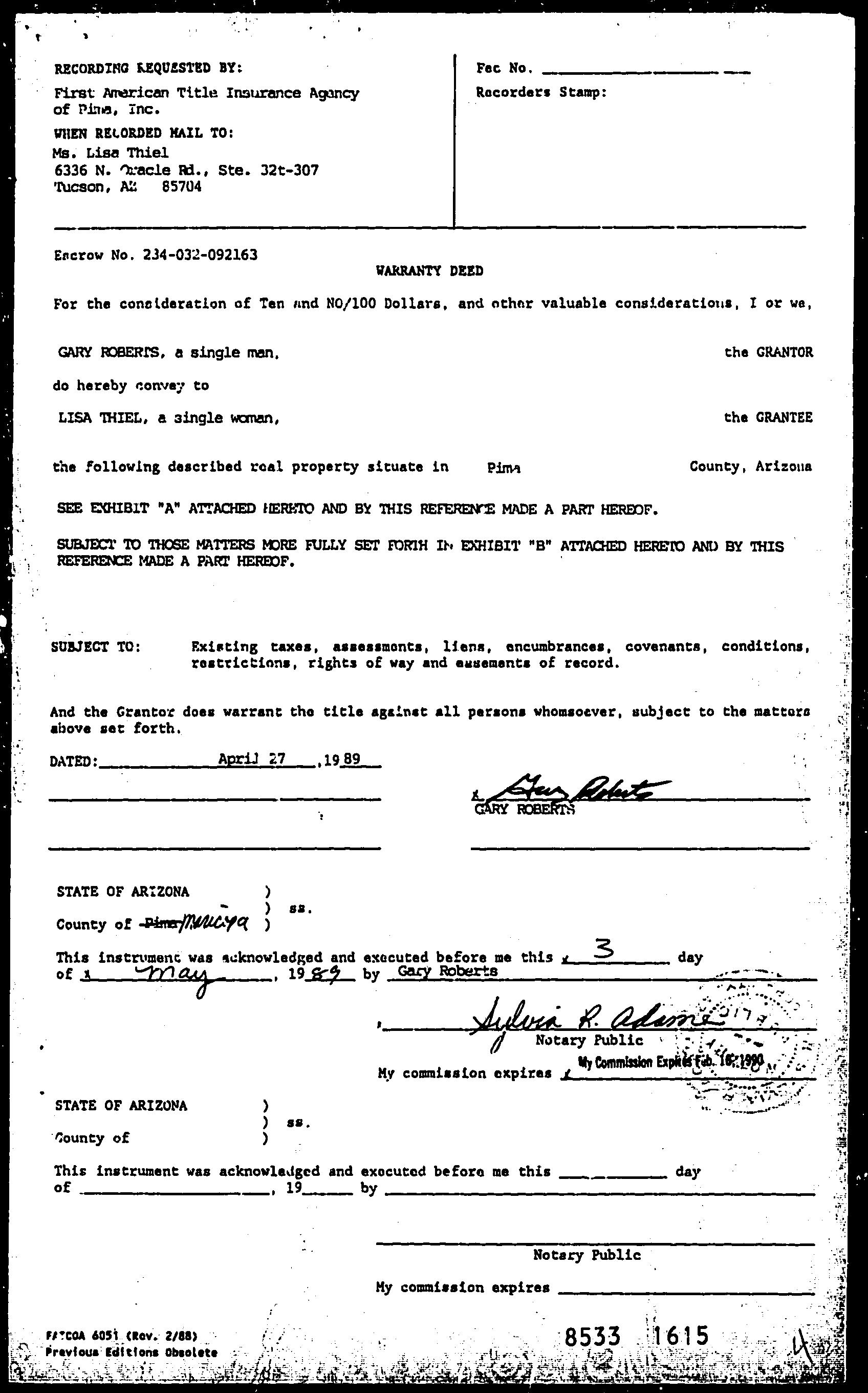 Rec. Date / Price: 05/09/1989 / $ Living Area: