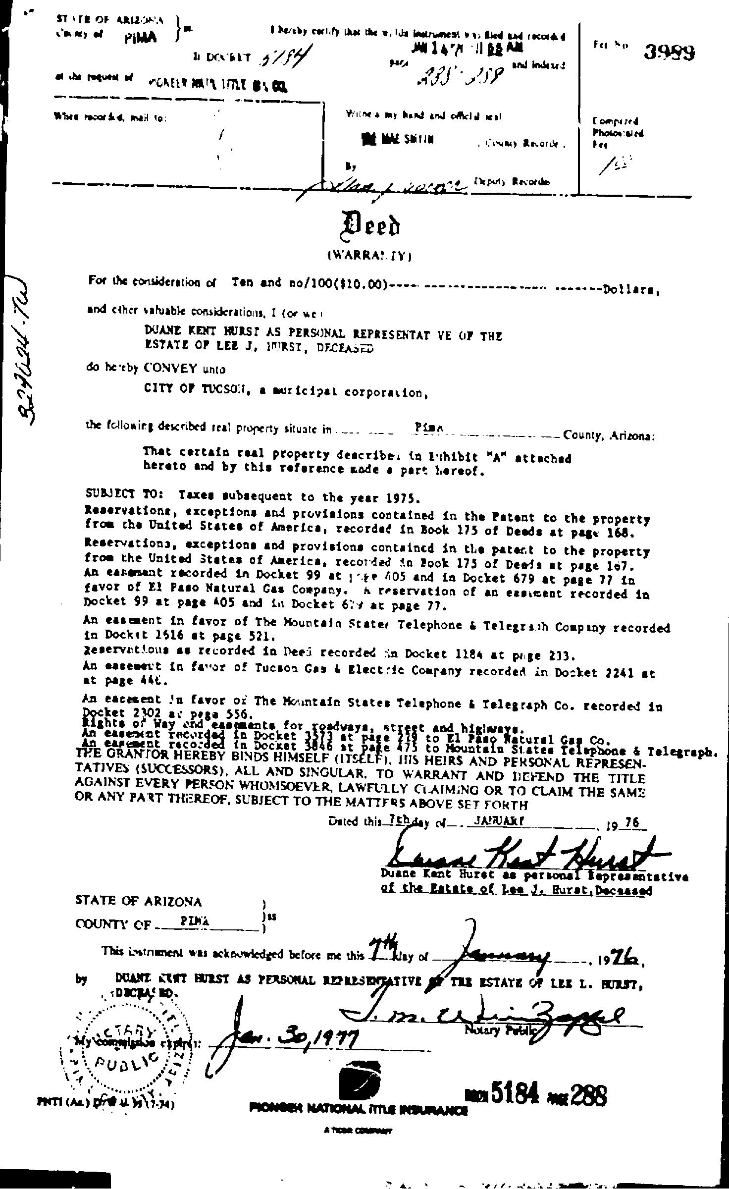 For the consideration of Ten and no/100($10.00)and cther valuable considerations, I (or we DUANE KENT HURST AS PERSONAL REPRESENTAT VE OF THE ESTATE OP LEZ J. IMURST, DECEASED do he'eby CONVEYunto CITY OF TUCSO1, amuricipal corporalion, the followirg described real property situate in. P