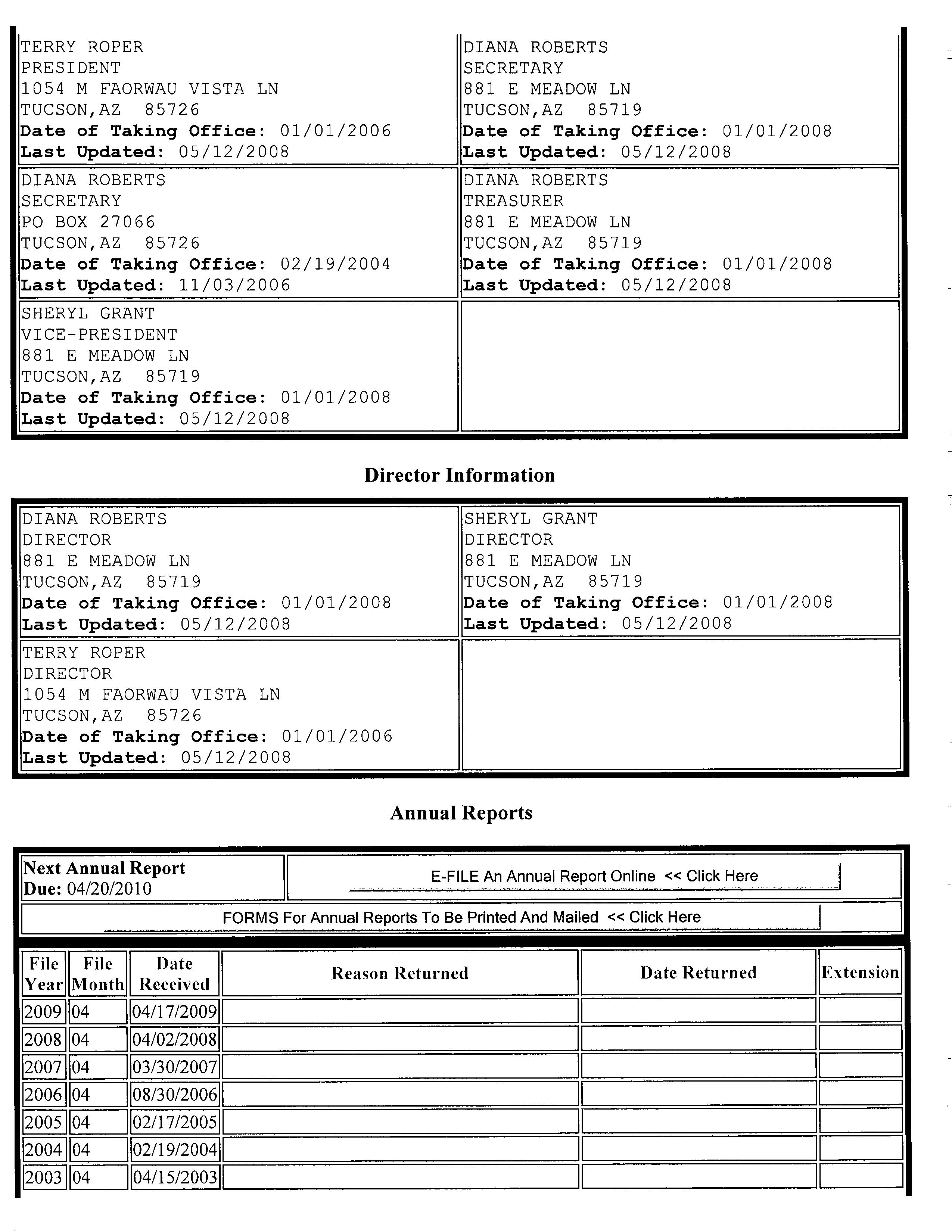 Mailing Address : 840 E Peppergrass Ln, Tucson AZ 85719-1058 C021