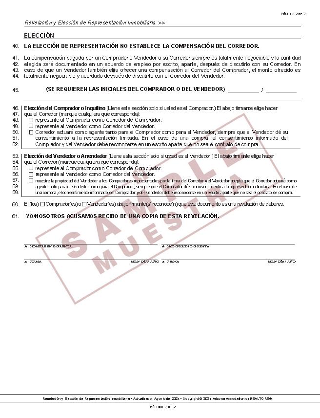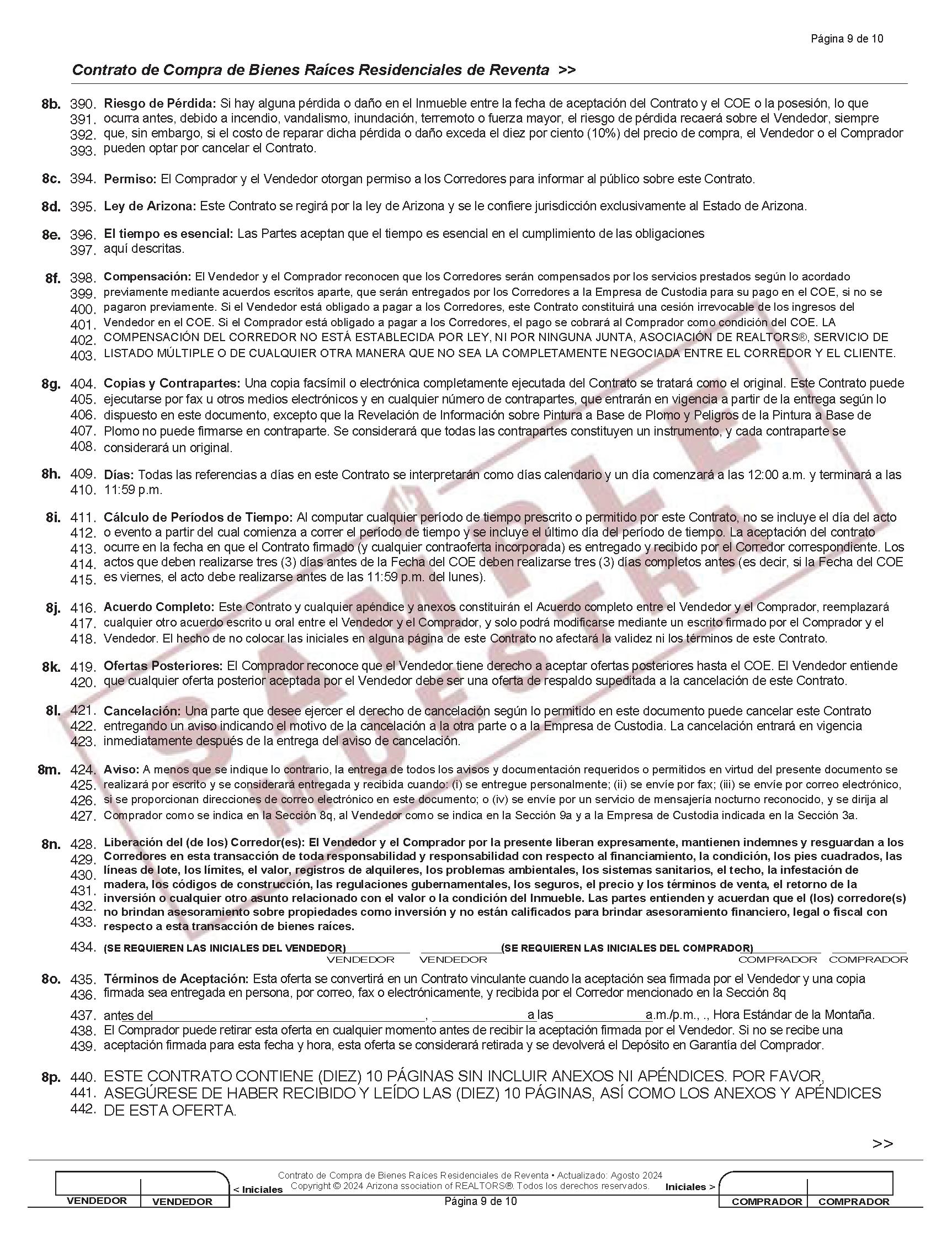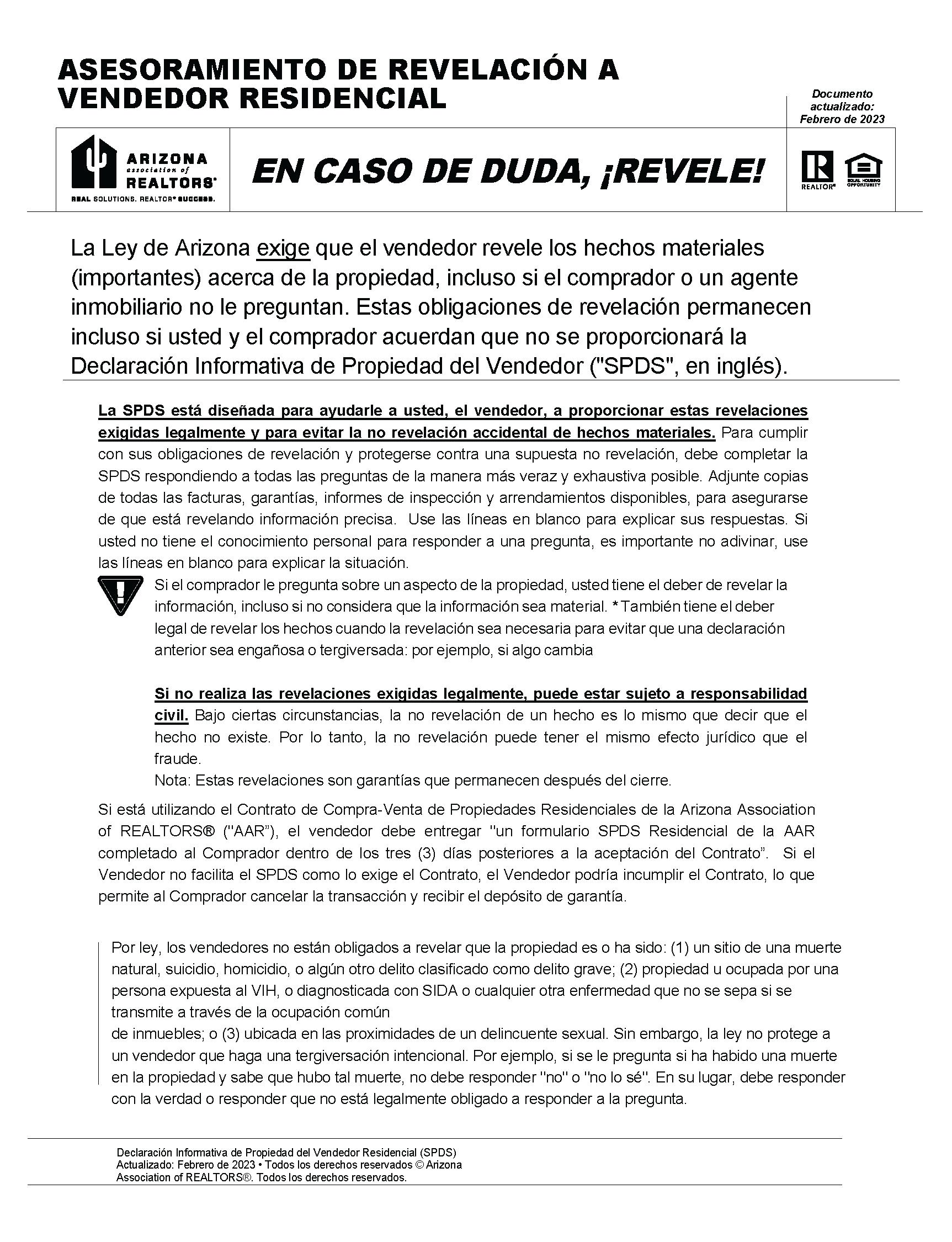 26. Sin importar a quien represente el Agente en la transacci6n, el Agente ejercera habilidad y atenci6n razonable en el desempefio de sus obligaciones, 27.y sera veraz y honesto tanto con el Comprador como con el Vendedor, divulgando todos los hechos conocidos que afecten de forma material y 28. adversa adversa la consideraci6n de recibir pago por cualquier parte. Conforme a A.R.S. Secci6n 32-2156, los Vendedores, Arrendadores y 29. Agentes no estan obligados a divulgar que una propiedad es o ha sido: (1) la ubicaci6n de una muerte natural, suicidio, homicidio u otro crimen 30.clasificado como delito mayor; (2) propiedad u ocupada por una persona expuesta al VIH, o diagnosticada con SIDA o cualquier otra enfermedad 31. que se desconoce se transmita mediante ocupaci6n comun de bienes inmuebles; o (3) ubicada en la cercanfa de un delincuente sexual. Los 32. Vendedores o sus representantes no la existencia, terminos o condiciones de ofertas como confidenciales a menos que exista un acuerdo de 33.confidencialidad entre las partes.
