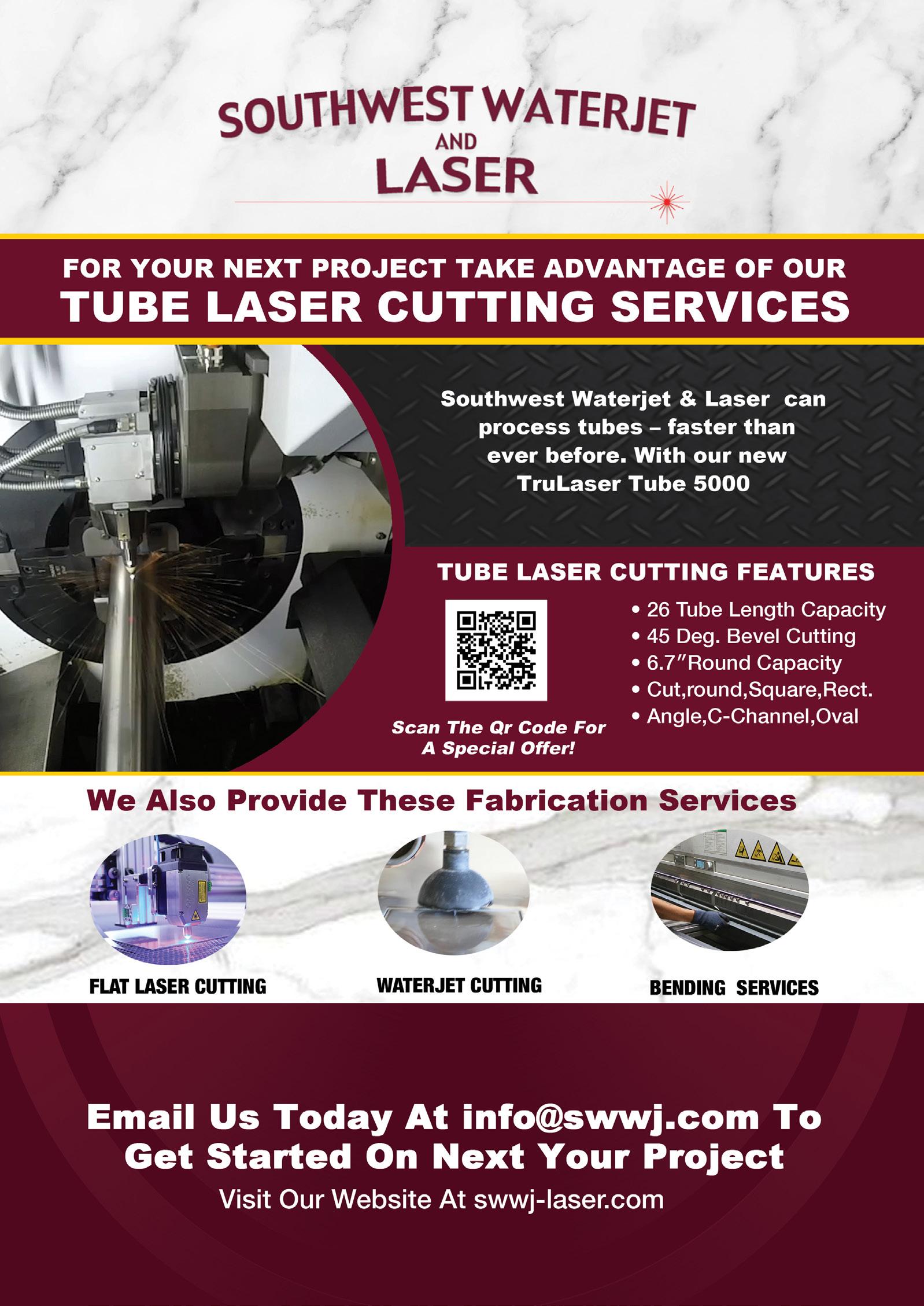 SWWJ’s comprehensive scope of services includes waterjet cutting, flat-sheet fiber laser cutting, tube laser cutting, precision forming, and value-added fabrication. The company’s investment in quality systems, advanced equipment, ITAR compliance, and digital manufacturing platforms continues to position SWWJ as a high-performing, competitive partner for complex manufacturing programs.