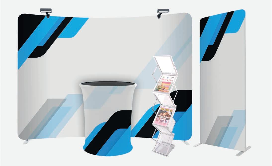 Messe-kit Soft | 1 stk. messevegg Soft wall buet 303x223cm med belysning. Messebord Quick counter XL. Soft stand 85x223cm og brosjyrestativ Elegante. Bildet viser et eksempel på layout, vi kan levere dette settet med design etter dine ønsker og behov. Gjør din stand komplett med dette settet for messer og eventer.