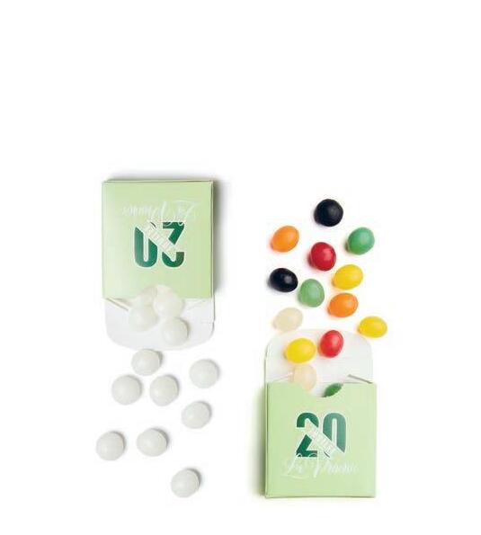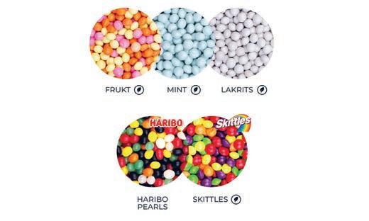 Dropsesker | Smaker: Small Fruitchewies (vegansk), Small Mintchewies (vegansk), Small Liquorice Chewies, Black Liquorice Chewies, Skittles Fruit (vegansk), Fruit Pearls, Chocolate Dragee, Liquorice Stick Dragee, Eucalyptus (tyggegummi), Strawberry Sour (tyggegummi), Sweet Mint (tyggegummi). Leveres i 250 stk/kartong.