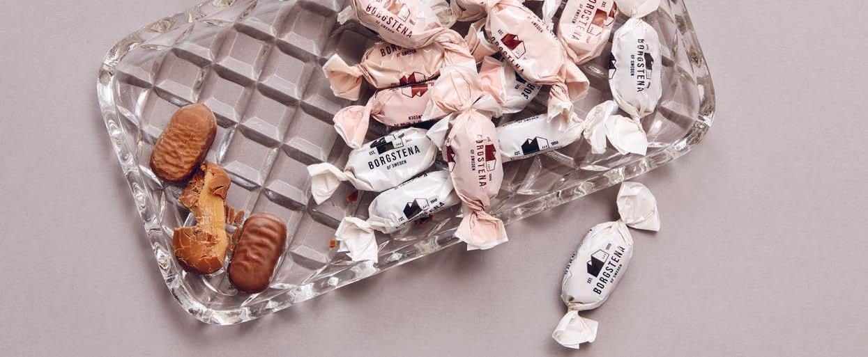 Borgstena Sjokoladekaramell | Smaker: Sjokolade/karamell, Sjokolade/Lakris. Produksjonstid: ca 20 dager. Holdbarhet ca. 12 måneder. Bestilles i jevne antall på 5 kg. Pakkes for transport i pappesker på 5 kg. Fleksotrykk i 1–4 PMS-farger på hvit cellofan.