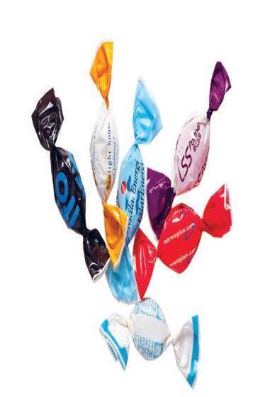 Tvistet drops | Populære drops i et stort utvalg av smaker. Fleksotrykk 1-4 PMS-farger på hvitt eller sølvcellofan. Smaker: Fruktmix, Mixed Flavour, Chocolate Filled Mint, Powder Packed Liquorice, Powder Packed Raspberry/Liquorice, Powder Packed Strawberry/ Liquorice, Powder Packed Liquorice & Fruit Mix, Mixed Flavour Sugar Free. Trykkes på komposterbart papir med vannbaserte farger.