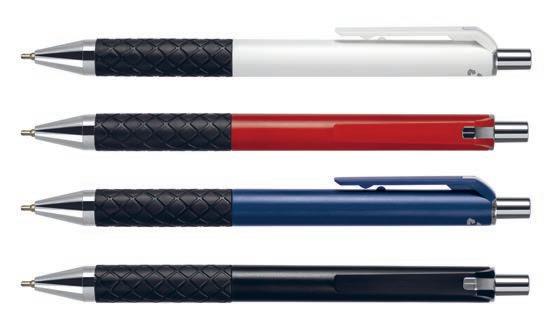 Script | Strenge og rette linjer kjennetegner Script-pennen. Matt pennekropp i dempede sobre farger i kontrast med kromdetaljer. Blått europeisk semi-gel blekk og kule i 0,7 mm. Materialene i Script består for det meste av resirkulerte materialer. Spissen, kroppen og trykknappen laget av resirkulert ABS og gummigrepet av resirkulert TPR. Leveres med et grått resirkuleringssymbol forhåndstrykt på motsatt side av klemmen. 151-000 hvit, 151-004 rød (ca pms 187c), 151-009 blå (ca pms 294c), 151-001 sort.