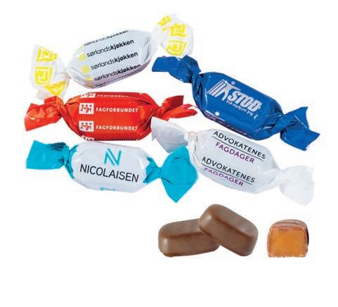 Choko Jack | Fra 30 kg. Myk karamell dyppet i sjokolade. Trykk i 1-4 PMS farger. Startkostnad 1000,-. 3590691 – Fløtekaramell med lys sjokolade. 3590694 – Sjokoladekaramell med mørk sjokolade. 3590699 – Lakriskaramell med lys sjokolade.