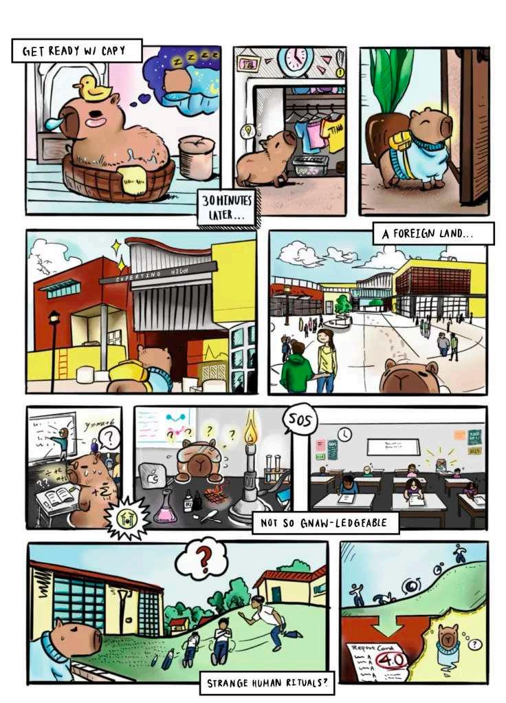 Bringing the issue to a close on page 28, Alexander Liu and Cathy Wu’s comic depicts the life of a capybara at CHS, from cheering each other on at rallies to spending time with friends at boba spots.