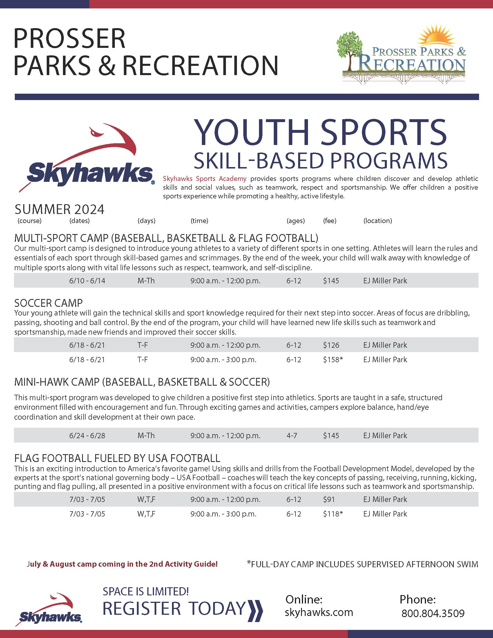 www.cityofprosser.com/parksandrec | (509) 786-2332 | parksandrec@ci.prosser.wa.us | 5 SUMMER CAMPS Online: www.skyhawks.com