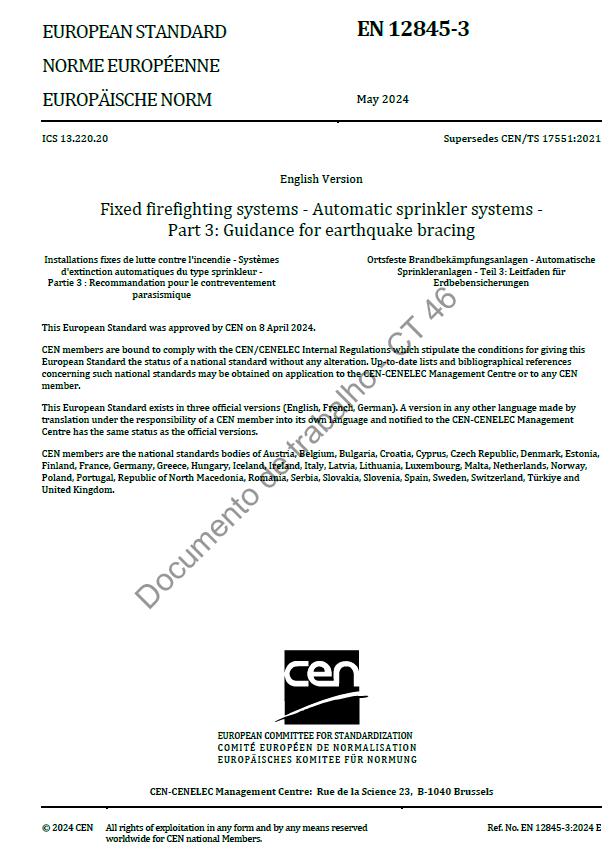 A NP EN 12845–3:2025 “SISTEMAS FIXOS DE COMBATE A INCÊNDIOS—SISTEMAS AUTOMÁTICOS DE EXTINÇÃO POR SPRINKLERS—ORIENTAÇÕES PARA SUPORTE ANTISISÍSMICO”