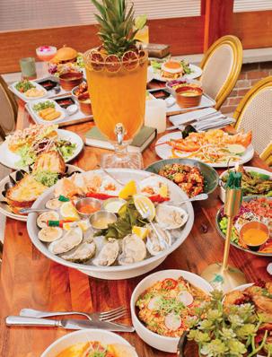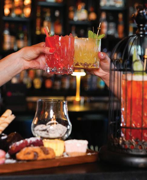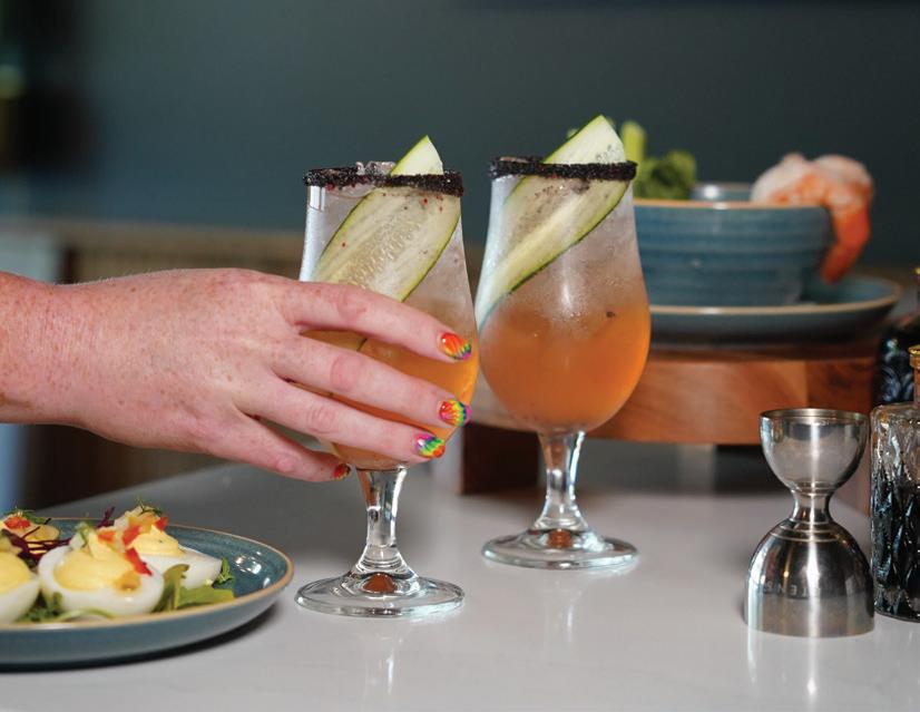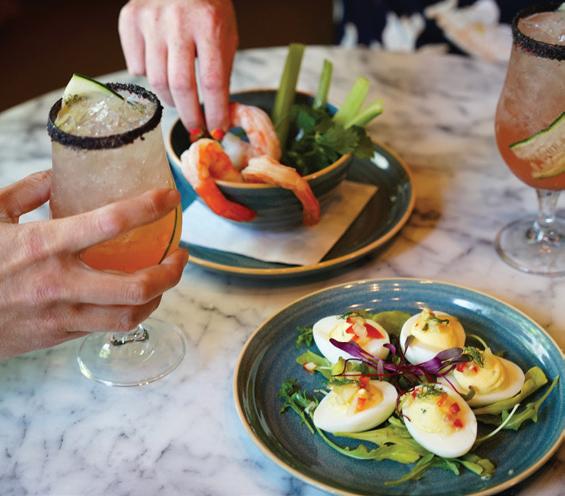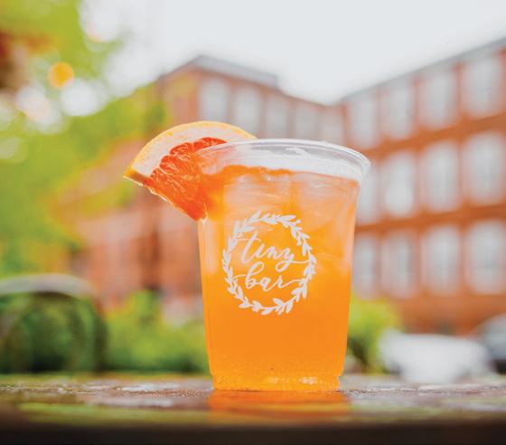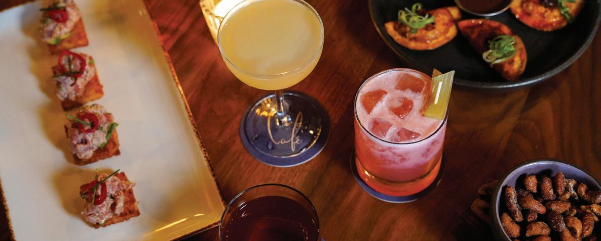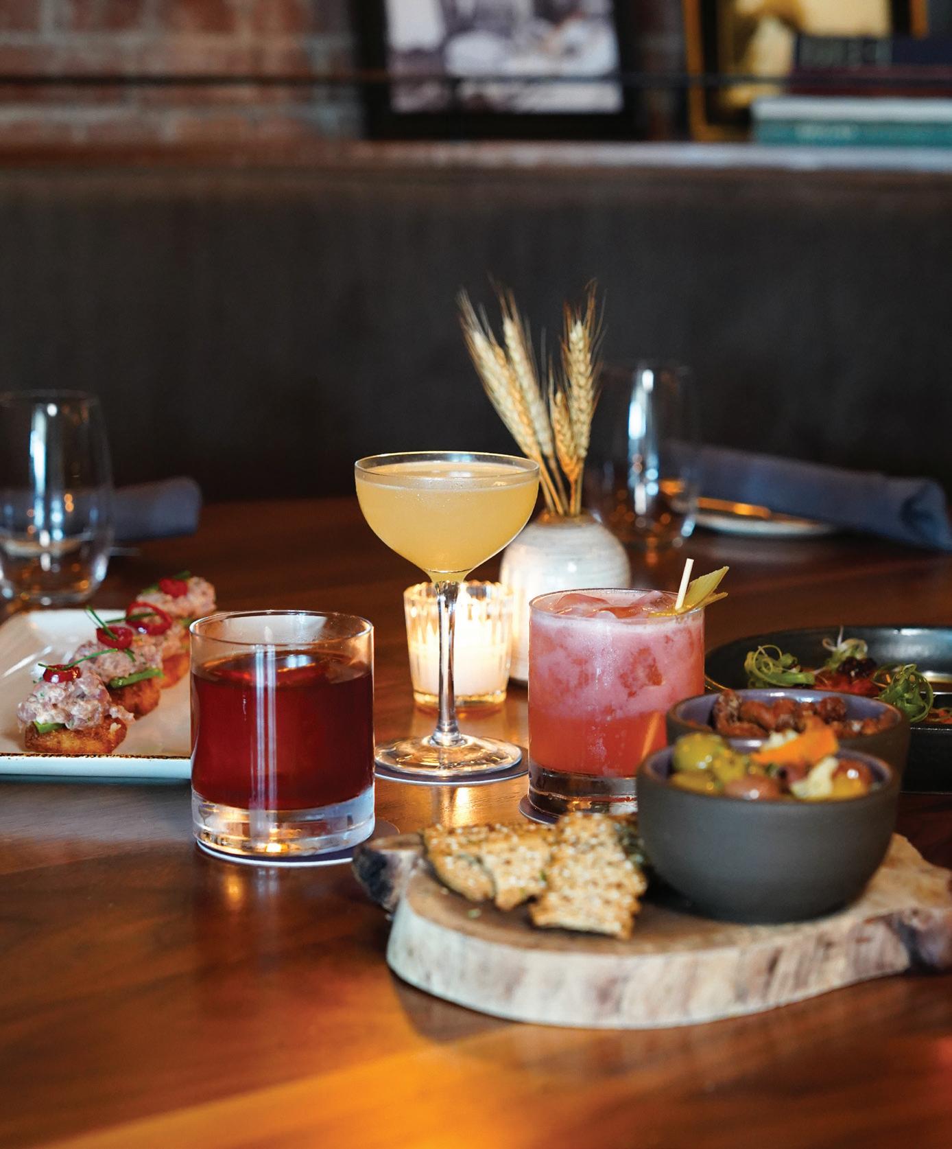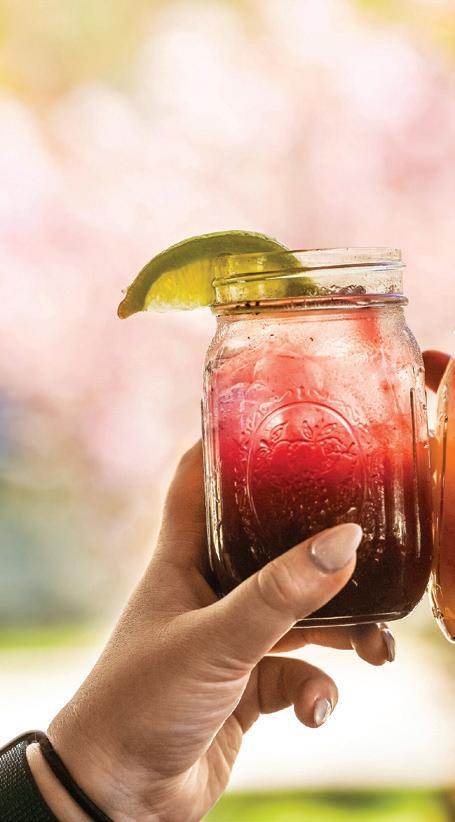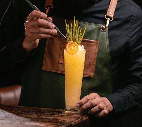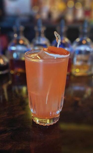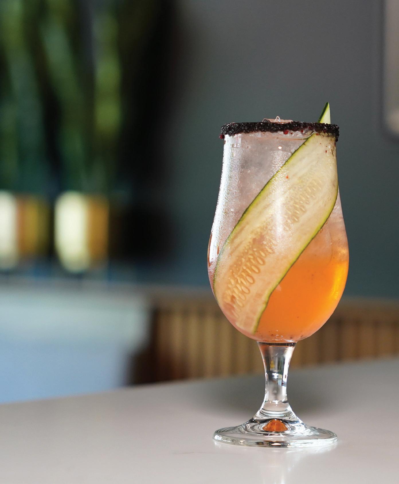 raspberry vodka, honey, blueberry, and lemonade, which Parker describes as the ideal beverage for “sitting outside on a hot day. It’s a drink you envision having on your front porch.” A leveled-up mocktail game also offers tropical sips like Caught in the Rain, prepared with cream of coconut, pineapple, and orange juice.