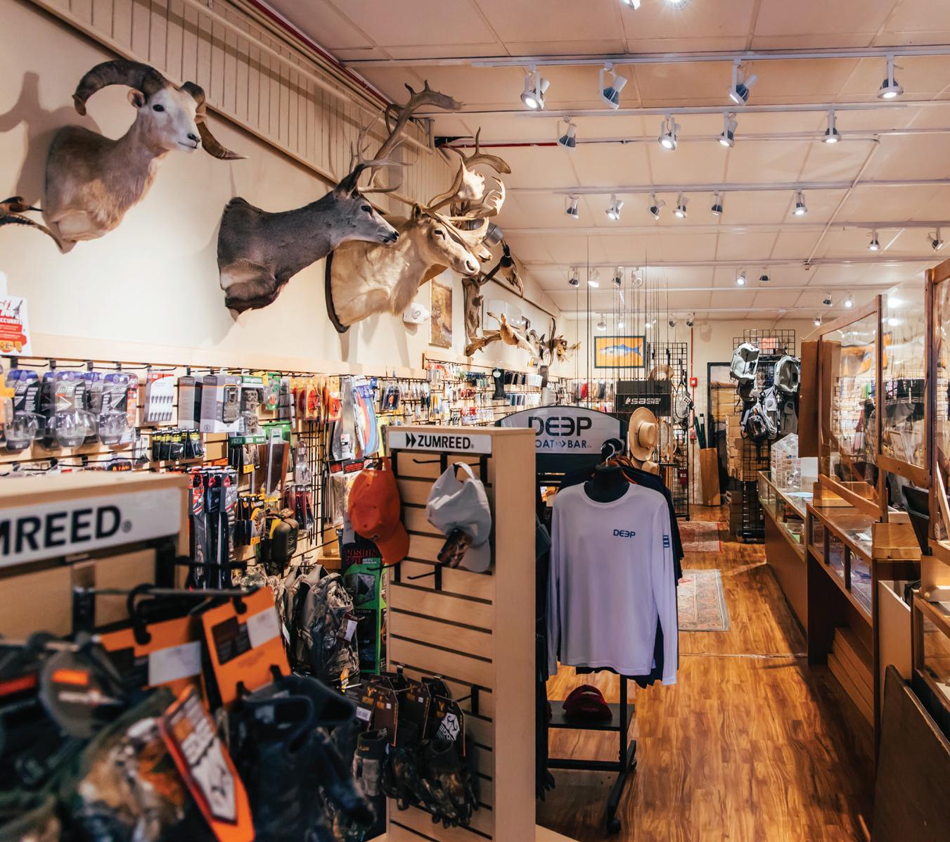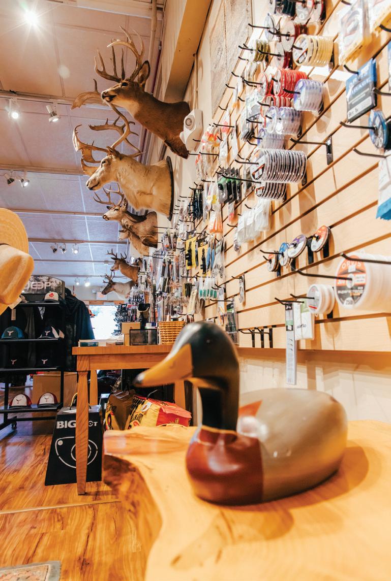 represented among the buck knives, nets, rods, reels, and clothes. Keep yourself out of sight by purchasing camo gear, and no need to climb a tree if you get a pop-up blind.