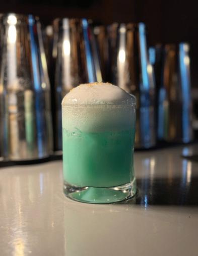 Blanco tequila, Cynar, blue curacao, and coconut liqueur, finished with a touch of salt and fresh coconut foam, served over ice, and garnished with a lime wedge