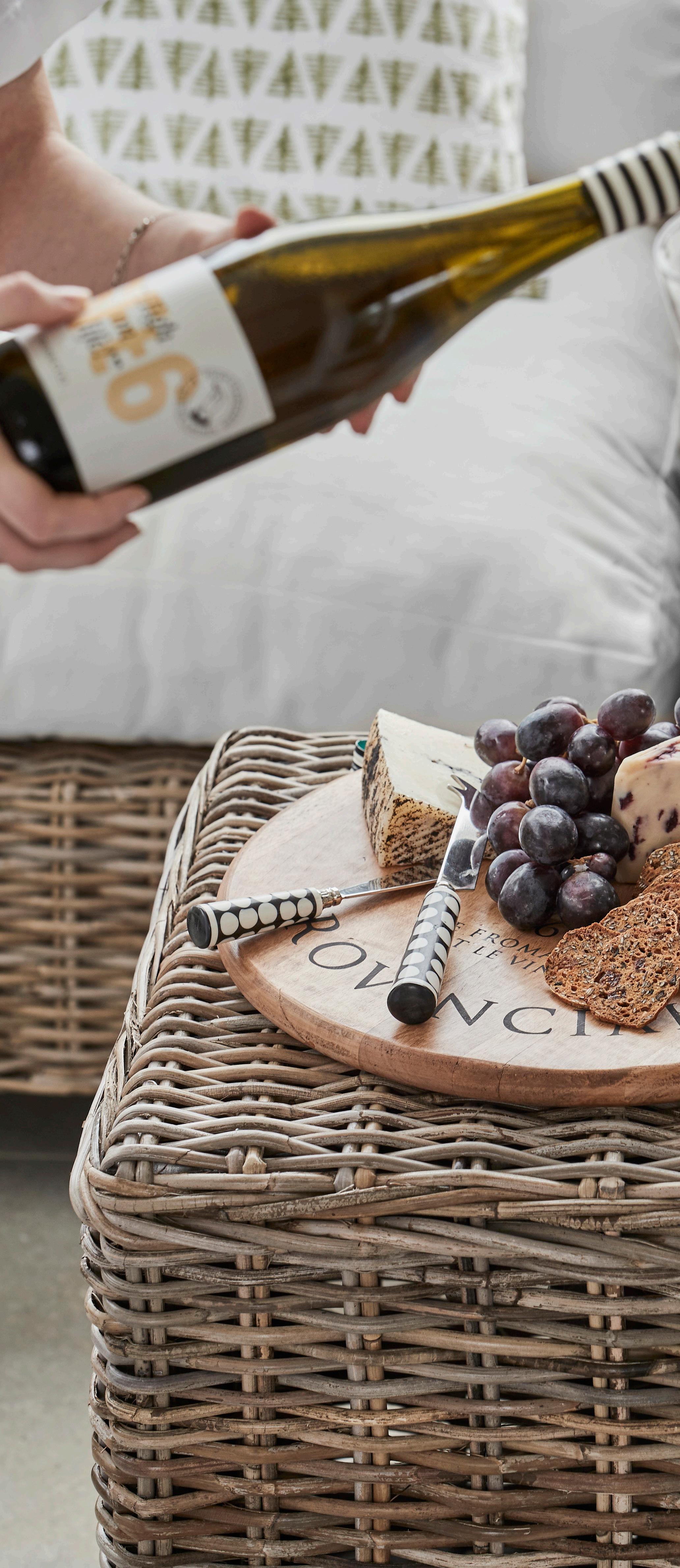 Cabo Table & Bench Set, $3099 | Jura Cheese Board, $79.95 | Belgrade Glassware, $49.95 | Winston Champagne Bucket, $199.95 | Bahamas Daybed, $1999