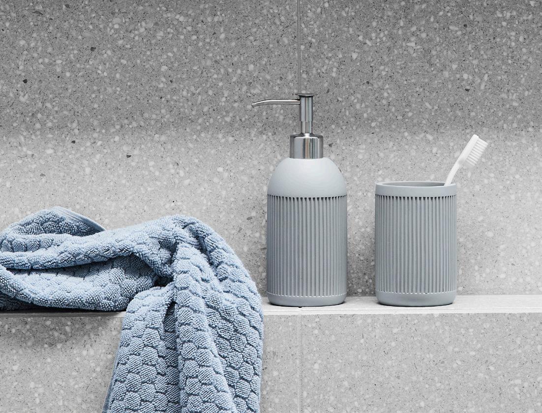 retreat. Crafted from polyresin and stainless steel in a soft dove grey colour that will look beautiful in most coloured bathrooms. Available in a cup, soap dish and a lotion dispenser.