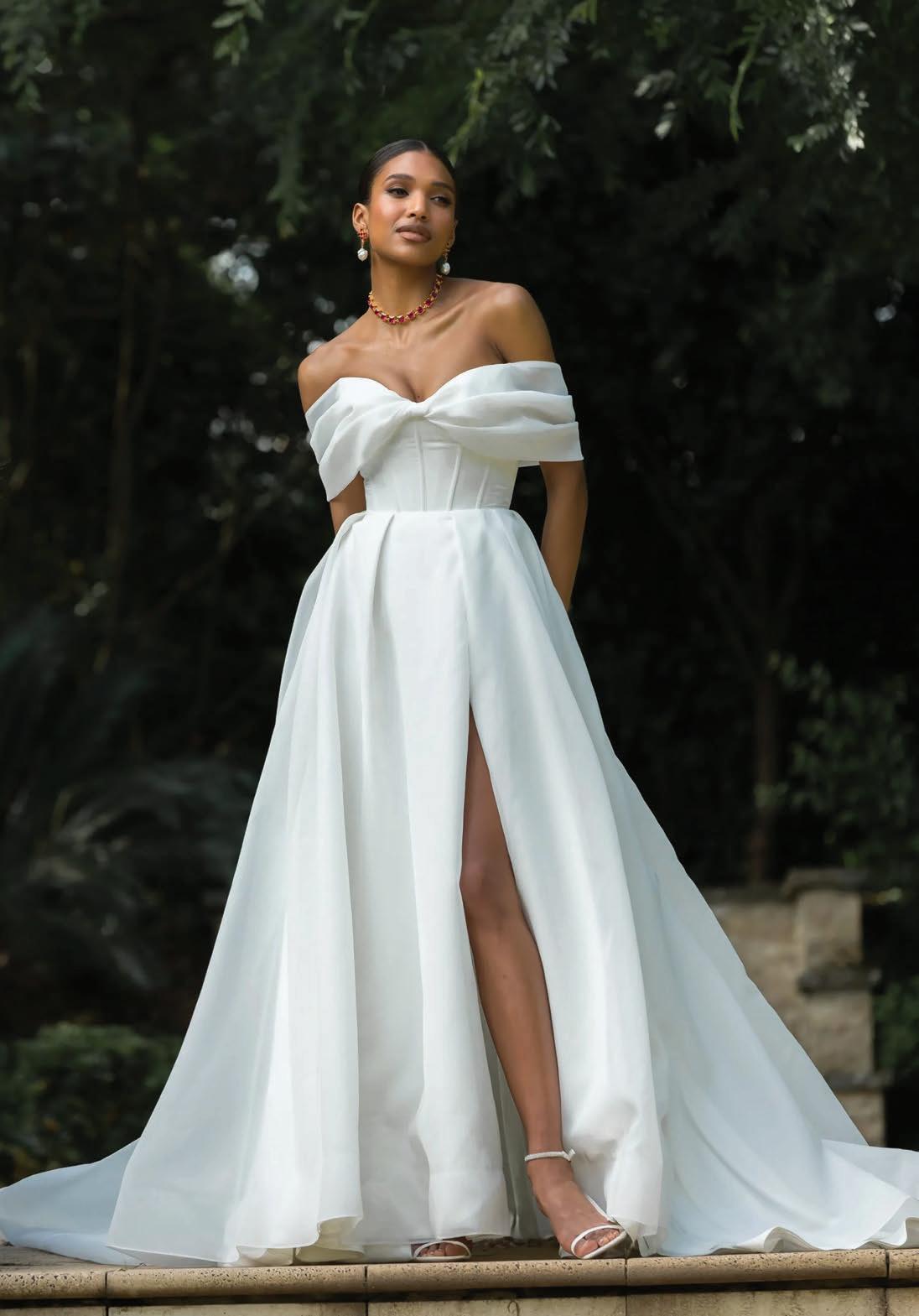 Clean lines, sleek silhouette with subtle details, open back exuding effortless chicness with designers like Justin Alexander. At times with bold elements, off-the-shoulder cuff, voluminous skirt or a gorgeous bow detail.