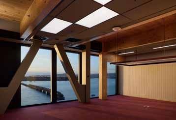 The project’s exposed Victorian Ash columns, inverted floor system of beams and planks, and a roof of radial timber rafters converging on a central skylight create a daylight-filled interior that foregrounds timber’s warmth and structural capability.
