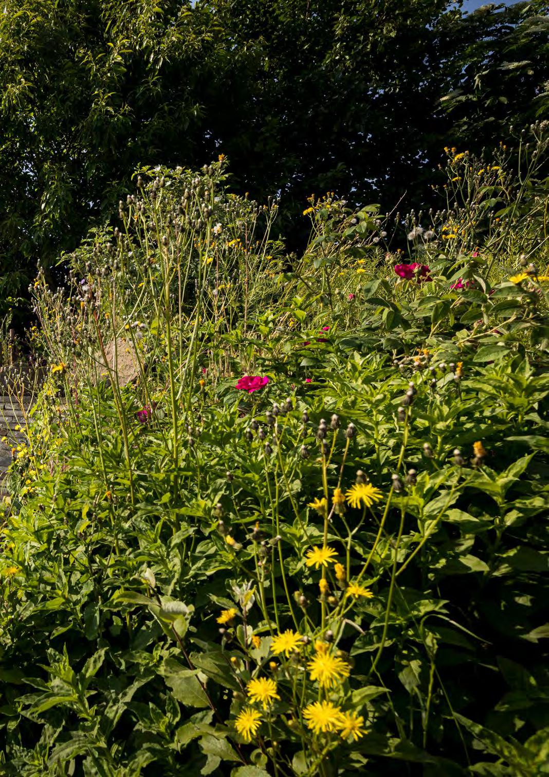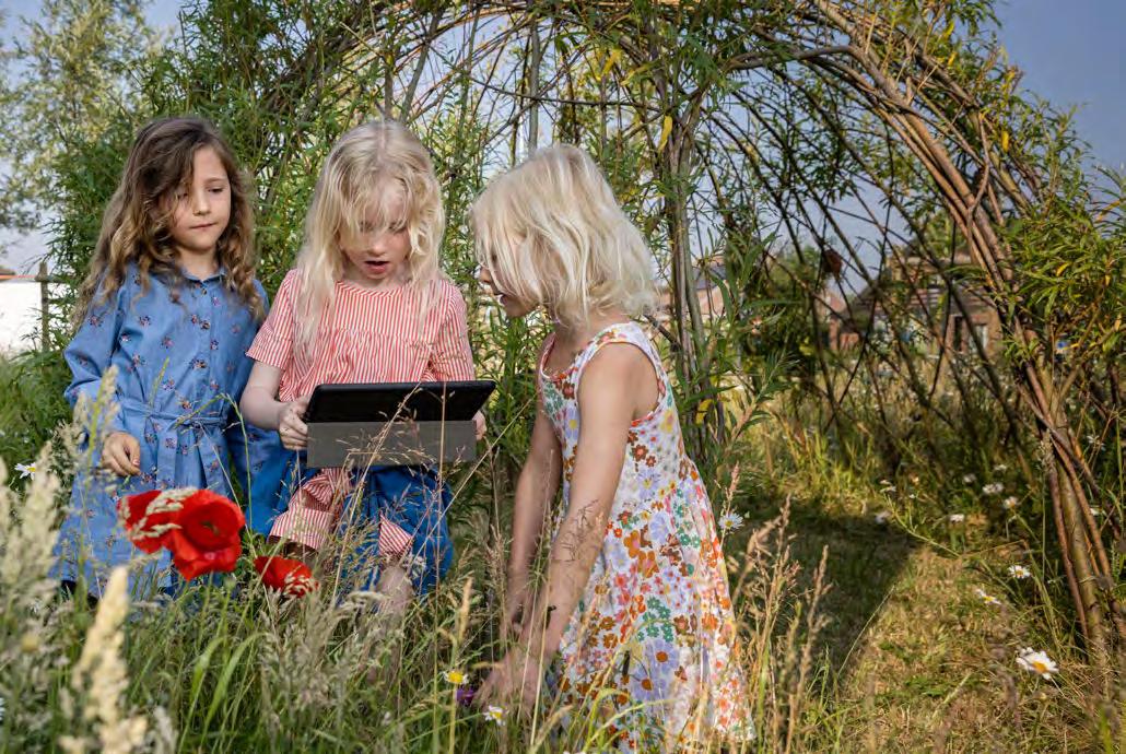 Van siergroen naar speelnatuur: breng het groen zo dicht mogelijk bij de spelende leerlingen. Laat ze glijden tussen de bloemen, zodat de verbondenheid groeit met wat er bloeit, kriebelt, fladdert en zoemt. Geef ze dat natuurcontact, en laat ze vrij en risicovol spelen. Dan leren ze het meest. (Kleuterschool De Robbert, Hamont-Achel)
