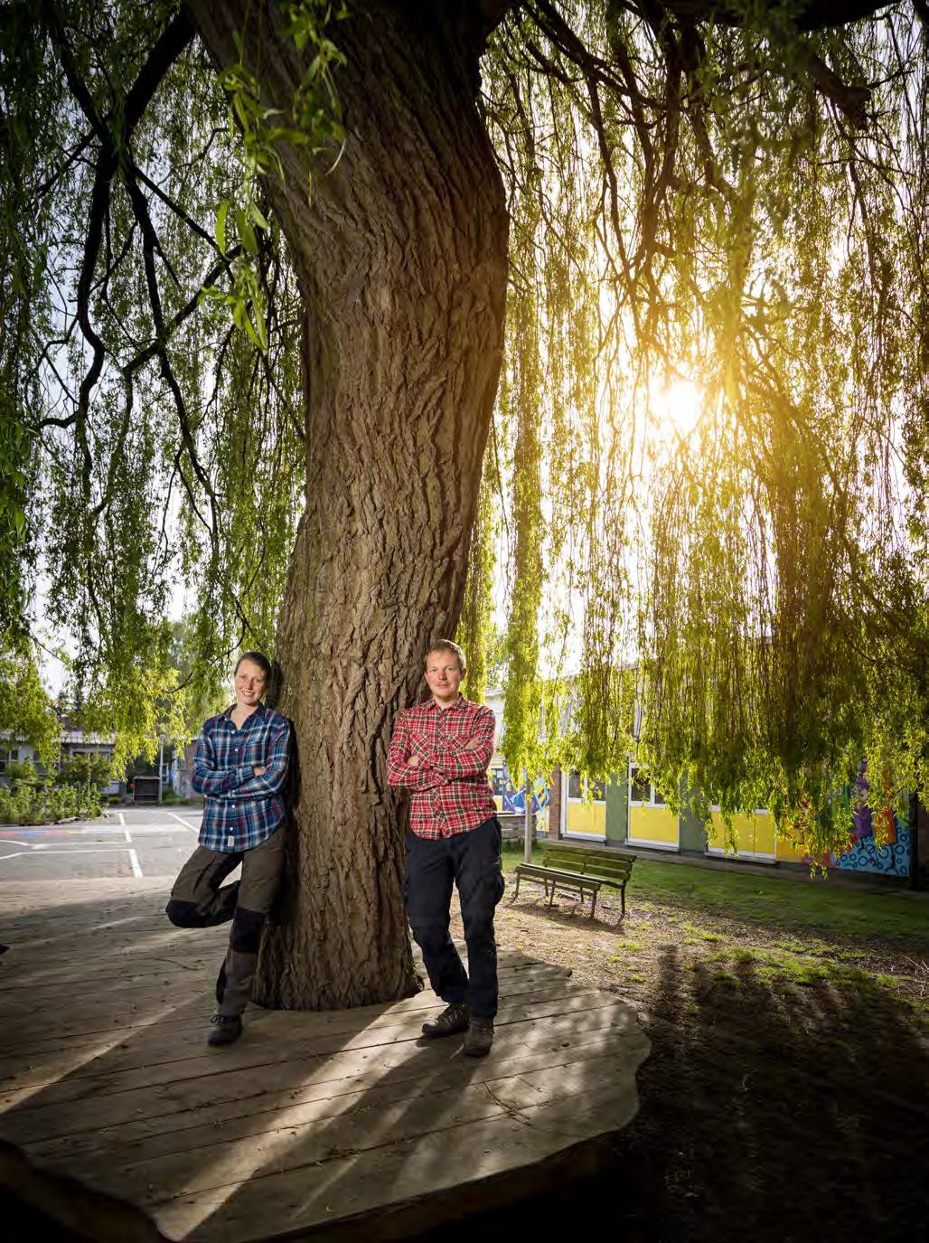“Before and during a greening project, we stimulate the school to discover and learn about existing green elements. After all, there are often many opportunities waiting to be discovered. We like to provide an upgrade to the green infrastructure already present.” (Paulien Vanhauwere (left) and Jeroen Rappé, green school designers Tree-Hive, photo taken at Herx Primary School, Herk-de-Stad)