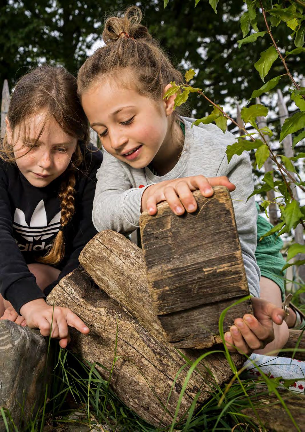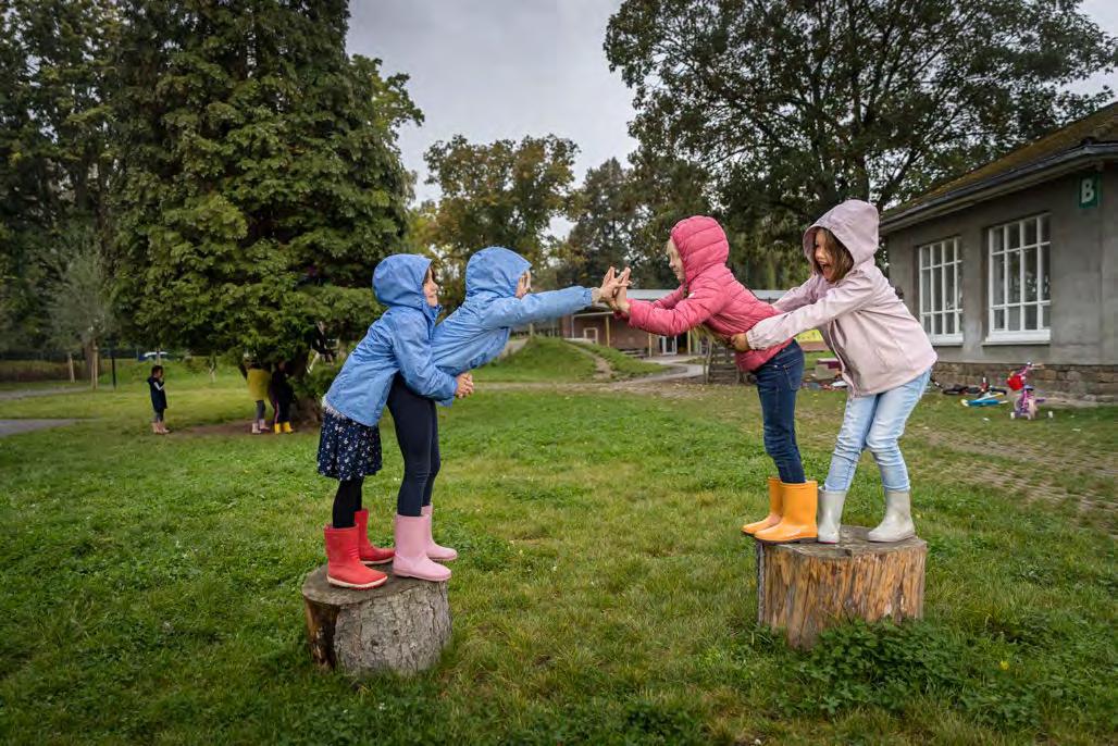 Not a single domain of a child’s development remains untouched if you imagine the experiences they’ll have. For example, understanding living nature when building a hatchery for stag beetles, or walking through a vegetable garden, moving without limits, and even learning risk assessment when running down a play hill or when climbing an obstacle course. Green surroundings invite to unwind, to be in contact with oneself and to be mindful. There are endless opportunities for creativity and problem-solving, for example when a pile of natural materials are to be given a new purpose. Non-stop interactions, deploying social competences and language of deliberation, sharing experiences and insights, expression, shouting, screaming, it’s all possible here!