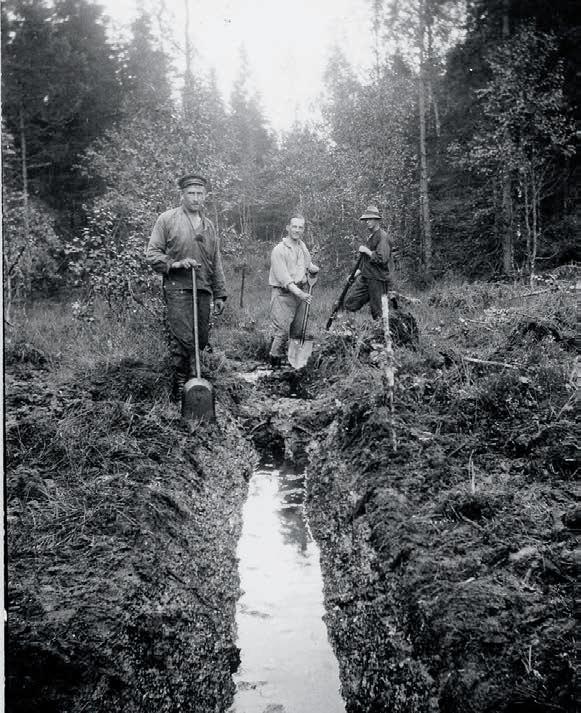 Till en början grävdes diken för att avvattna skogsmarken. När kalhyggesbruket blev mer vanligt uppstod ett annat behov av drä nering. Så länge skogen står där som ett ”paraply” kommer inte all nederbörd att nå marken, utan fångas i trädkronorna där vattnet senare avdunstar. Dessutom förbrukar träden en del av det vatten som når markytan och rotzonen, och en växtlig skog kan själv drä nera marken. När kalhygget breder ut sig stiger grundvattenytan och marken blir blötare. Plantering och återväxt hotas. För att råda bot på det började man skyddsdika, en åtgärd som det krävs till stånd för. Ingreppet får inte åstadkomma permanent avvattning av skogen utan bara leda bort det tillfälliga vattenöverskottet. Lyckligtvis har kunskapen om biologisk mångfald och hydrolo giska samband i skogsmarkerna vunnit gehör under senare år. Vatt net i skogen har på så sätt blivit synligt igen. Skogen är inte längre bara en produktionsplats för timmer och massaved; den har långt viktigare funktioner för hela ekosystemet och därmed för samhället. Därför har den storskaliga dikningen av skogsmark förbjudits i södra och mellersta Sverige och förekommer endast sparsamt i norr.