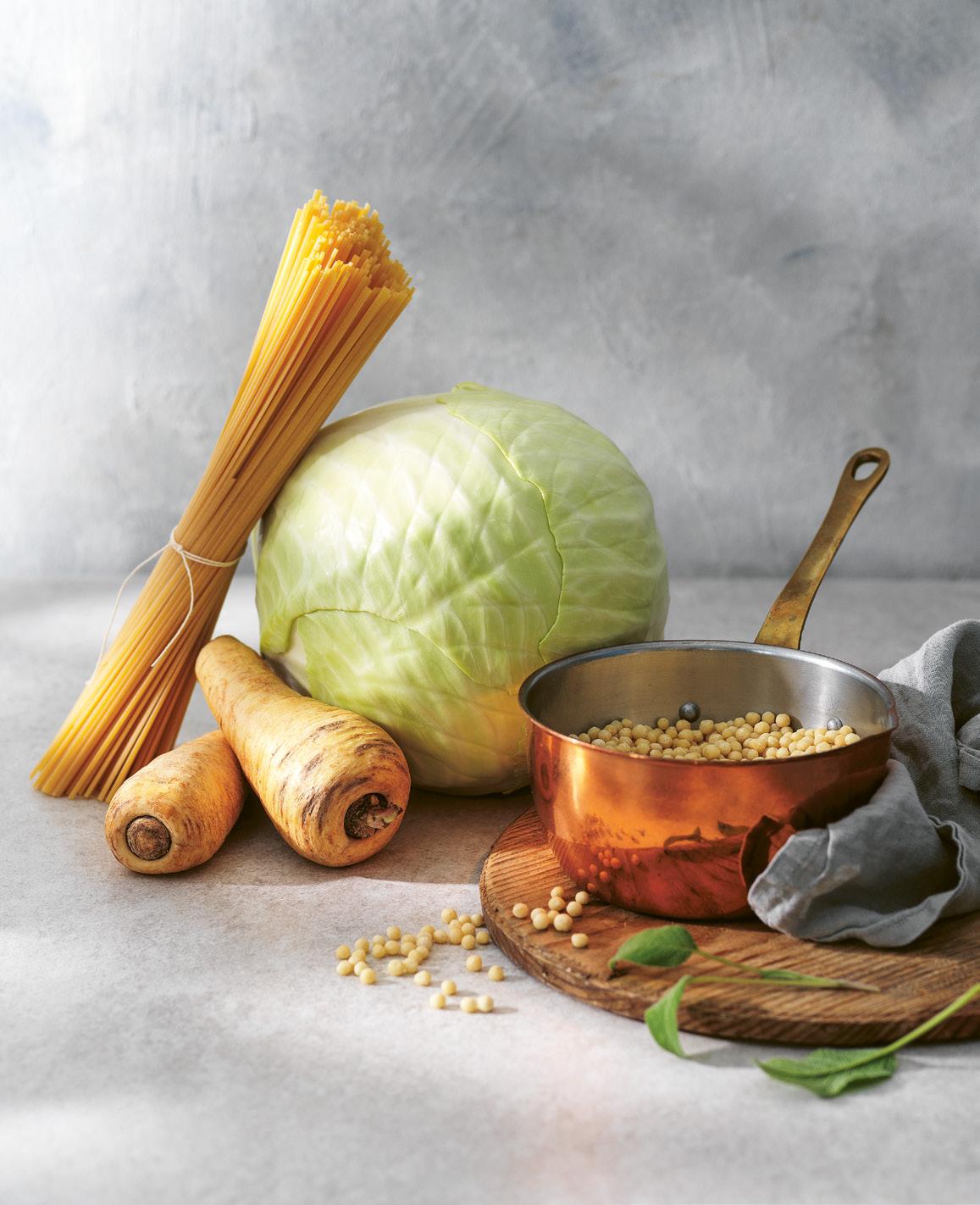 När soppan kokat i 45 minuter tar du upp lagerbladen och svartpepparkornen och skummar av soppan. Lägg ner de frästa grönsakerna och låt allt koka upp. Koka i ytterligare 35 minuter.