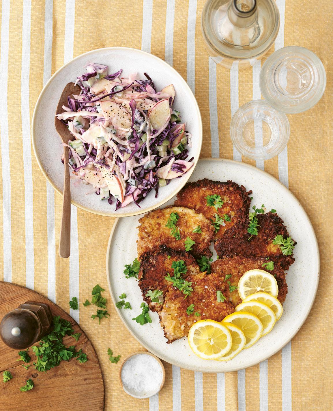 Vispa upp äggen i en djup tallrik och häll panko och riven ost i en annan djup tallrik. Vänd fläskköttet i det uppvispade ägget och sedan i panko- och ostblandningen.