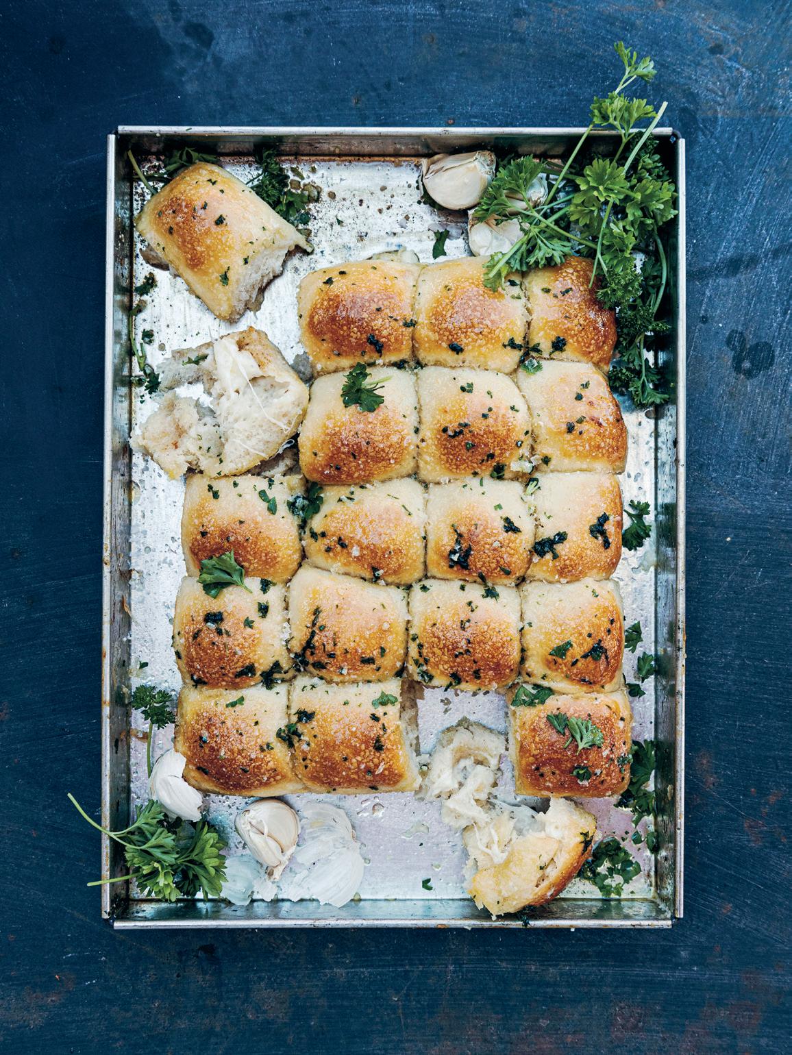 9. Ta ut bröden ur ugnen och pensla dem direkt med vitlökssmöret. Strö över flingsalt. Ät medan bröden är ljumma.