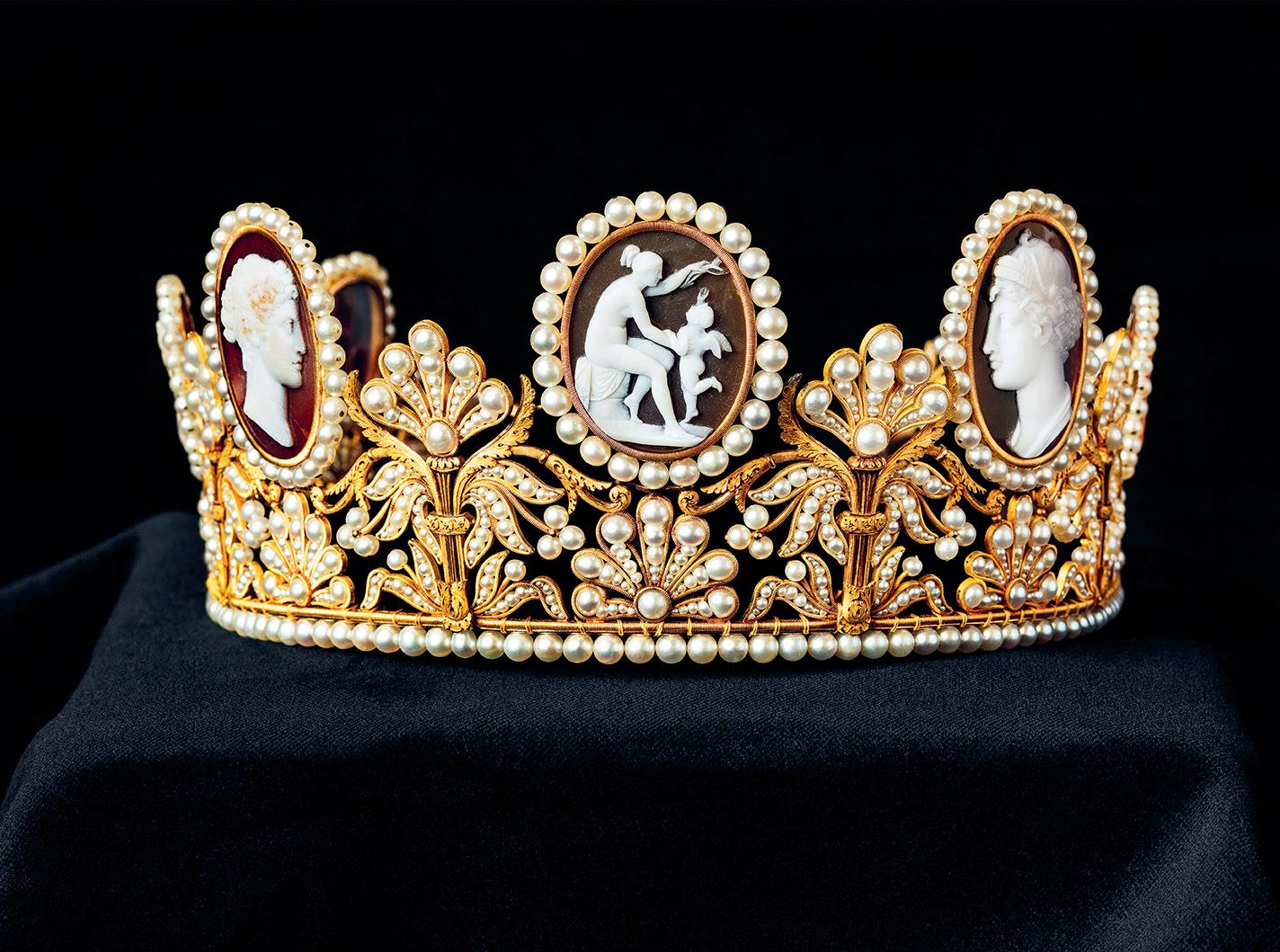 Joséphine som kronprinsessa med, så långt jag kan se, hela det fantastiska kamégarnityret på en målning från 1836 av Fredric Westin. Smycket var en gåva från kejsar Napoleon till sin kejsarinna Joséphine, året var troligen 1805. Och vilken gåva – tillverkat av ädla material som guld, pärlor, briljanter och stora och vackert formgivna kaméer. Garnityr kallas det på grund av de många beståndsdelarna – diadem, örhängen, halsband, brosch, två armband – allt tillverkat av tidens främsta juvelerare i Frankrike.
