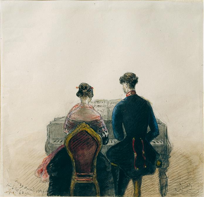 Prinsessan Eugénie var, liksom bröderna, konstnärligt mångsidig och mycket aktiv, hon sjöng och musicerade gärna, men framför allt fångade hon ofta det hon var med om i ett dagsboksliknande akvarellmåleri. Som här på uppslaget, där hon på första bilden noterat att hennes bror Gustaf spelade fyrhändigt med hovfröken Mathilda Bennet ända från »6 till ½ 8 afton« en aprilkväll 1849.