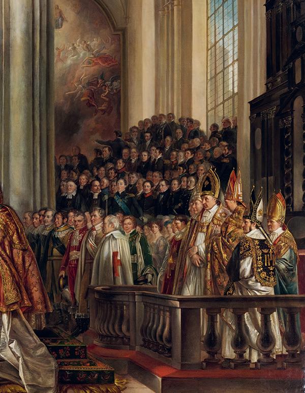 I den fullsatta Storkyrkan ser man till vänster kungen, flankerad av drottningen och prinsessan Sophia Albertina. Till höger är ledamöter i ståndsriksdagen och kyrkans biskopar talrikt representerade innanför altarskranket. Alla är förstås vända mot brudparet som får ringarna välsignade av ärkebiskopen Carl von Rosenstein. Upp under valven steg den idoge psalmdiktaren Johan Olof Wallins specialskrivna bröllopskantat. På en icke förevigad plats i kyrkan fanns Joséphines katolske själasörjare Lorenz Studach; hans närvaro hade villkorats – han fick inte komma prästklädd.
